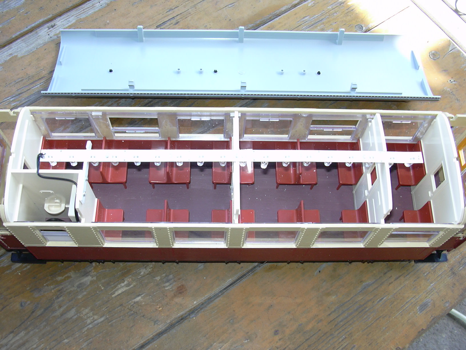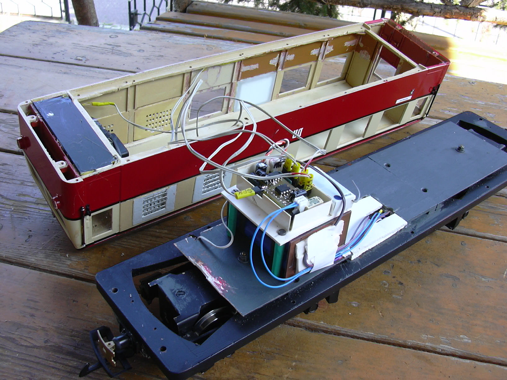 Blick von oben auf Chassis und Karosserie. Man sieht neben der Kabelei auch den eingeklebten Lautsprecher und die LED-Leiste der Innenbeleuchtung.