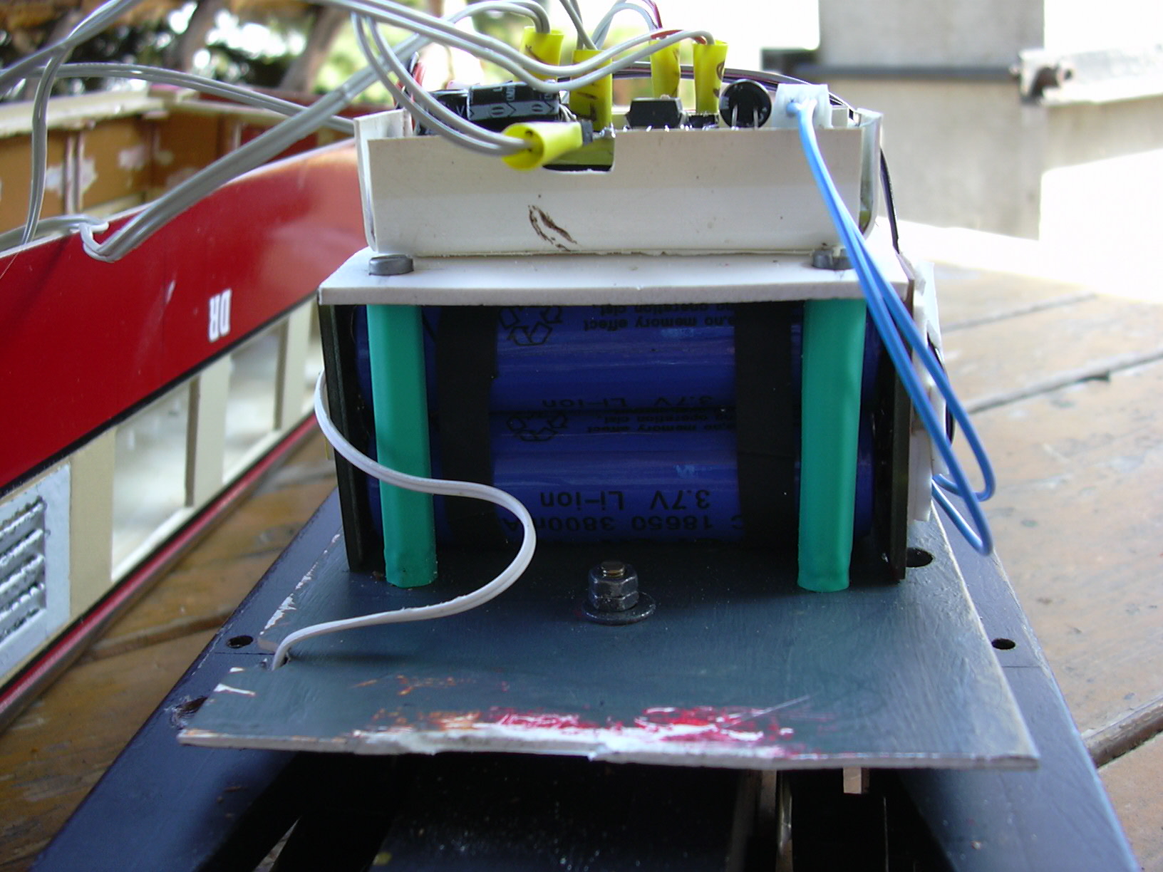 Die Befestigung dieser Einheit erfolgte mit M3-Abstandbolzen (unter dem grünen Schrumpfschlauch). Unten ist die Batteriekammer für die 6 Rundzellen, oben auf der Trägerplatte wurde mit Teppichklebeband das "Bettchen" für den Lokfahrtregler (mit Soundmodul) und dahinter der Funkempfänger aufgeklebt.