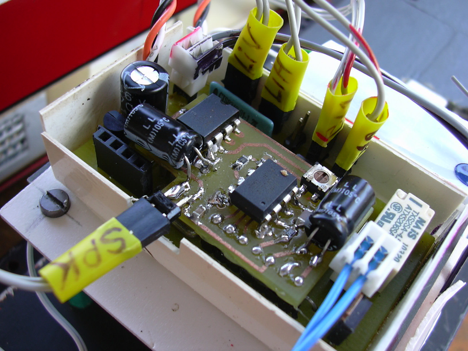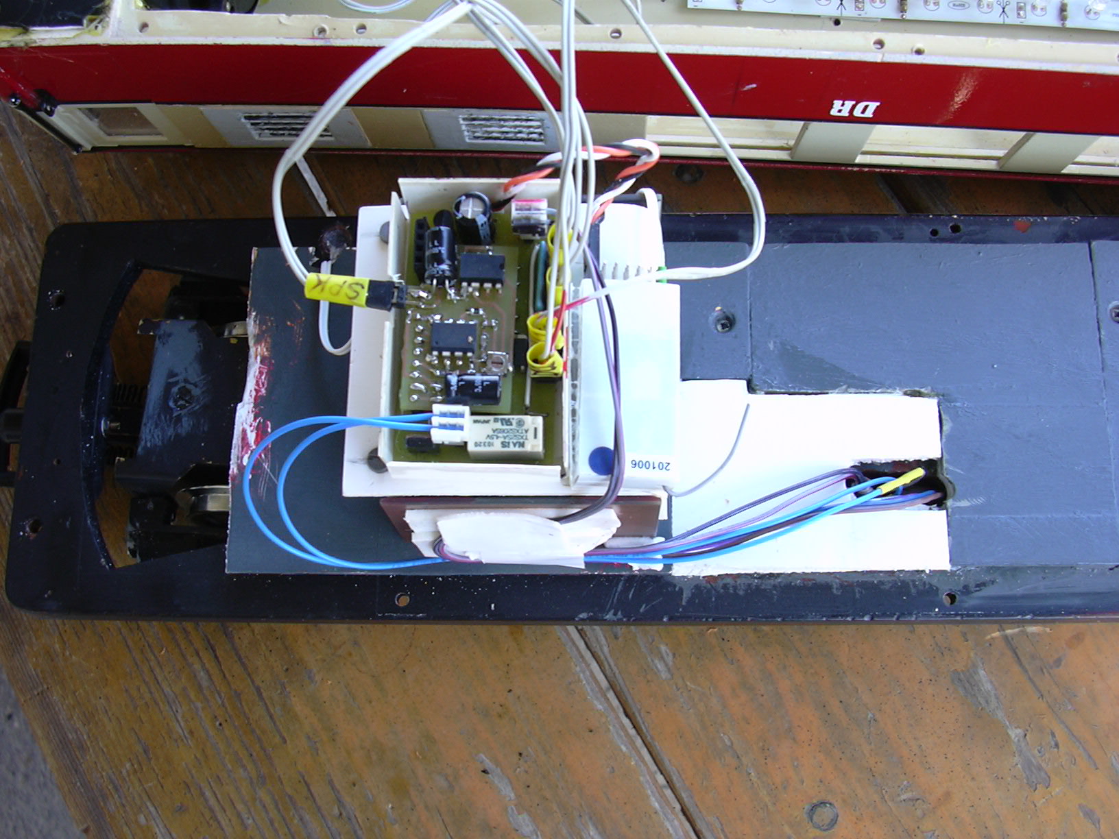 Lokfahrtregler im "Bettchen". Links oben ist das dreiadrige Kabel zum Funkempfänger fest angeschlossen. Dann folgen die Steckverbinder für Stromversorgung, Scheinwerfer vorn, Scheinwerfer hinten, Schaltfunktion 3 (unbenutzt), Schaltfunktion 2 (Fahrgastraumbeleuchtung Triebwagen) und Schaltfunktion 1 (Steckdose für Fahrgastraumbeleuchtung Steuerwagen). Ganz rechts am Relais ist der Fahrmotor angeschlossen. Ganz links ist die 4-polige Buchsenleiste für das PC-Interface, mit dem der Lokfahrtregler parametriert werden kann. Auf dem Fahrtregler steckt die Soundplatine, links vorn ist der Lautsprecher angeschlossen.