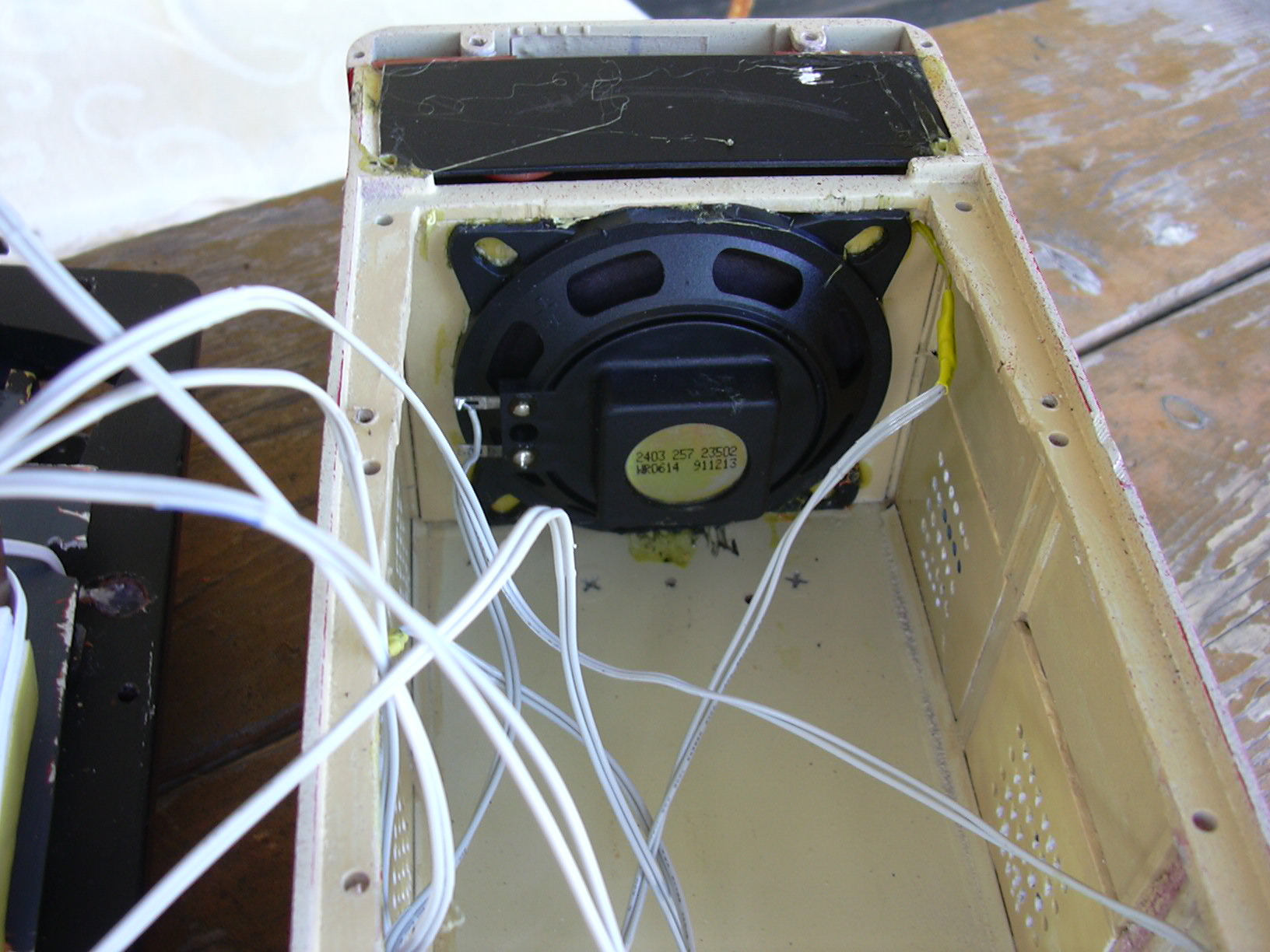 Vom Lautsprecher wurde oben und unten ein schmaler Streifen von Korb und Befestigungslaschen abgeflext, da er ein paar wenige Millimeter zu groß war. Das Einkleben erfolgte mit Kontakkleber.