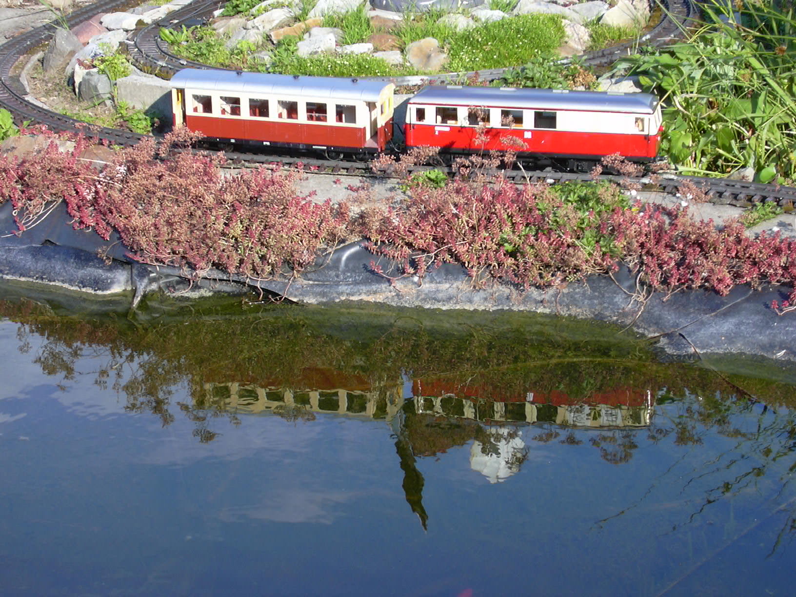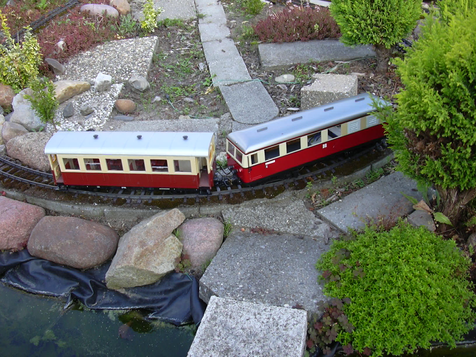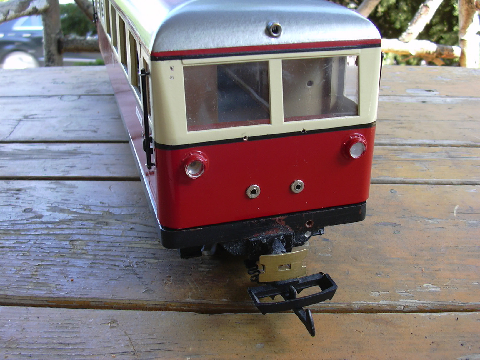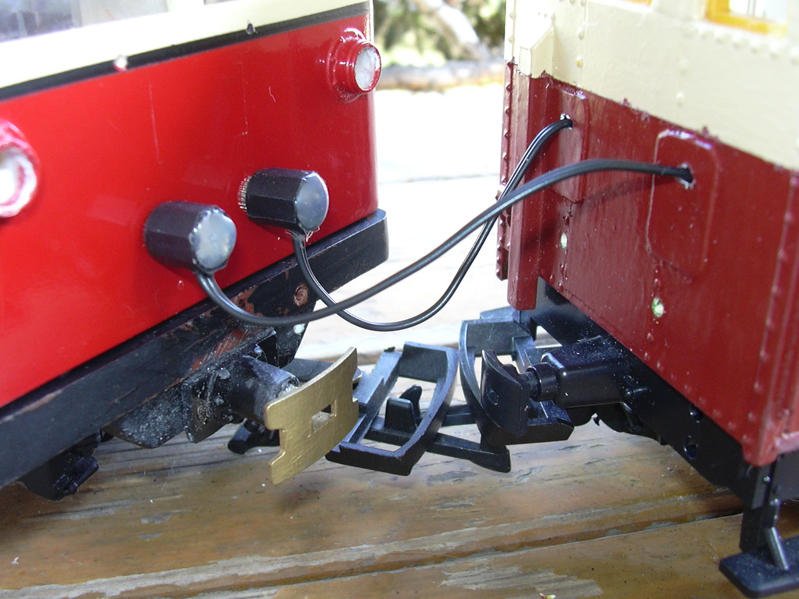 Triebwagen und Steuerwagen in gekuppeltem Zustand. Die beiden Löcher im Steuerwagen (rechts unter den Kabeln) waren schon vorhanden, ich habe sie auf 2,5mm aufgebohrt, damit man bei getrennten Fahrzeugen die Stecker "entsorgen" kann und sie sich nicht immer in den Kupplungen verhaken.