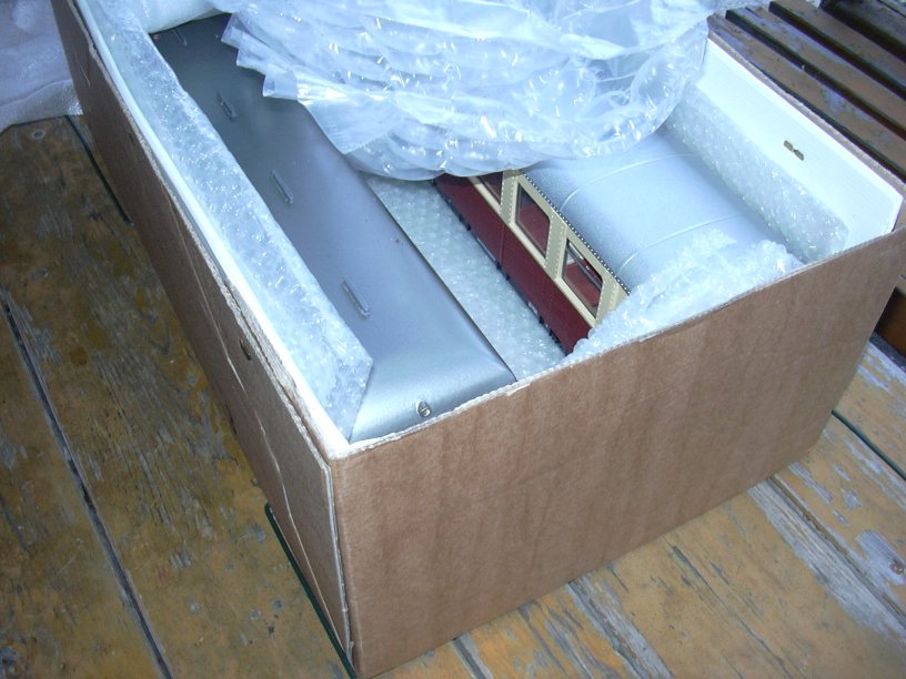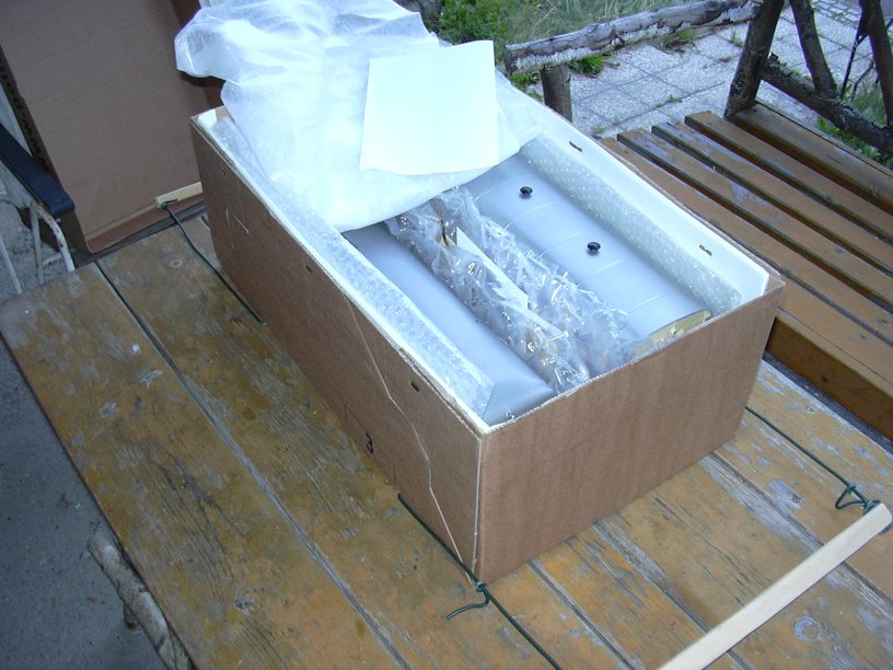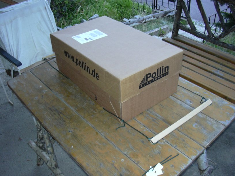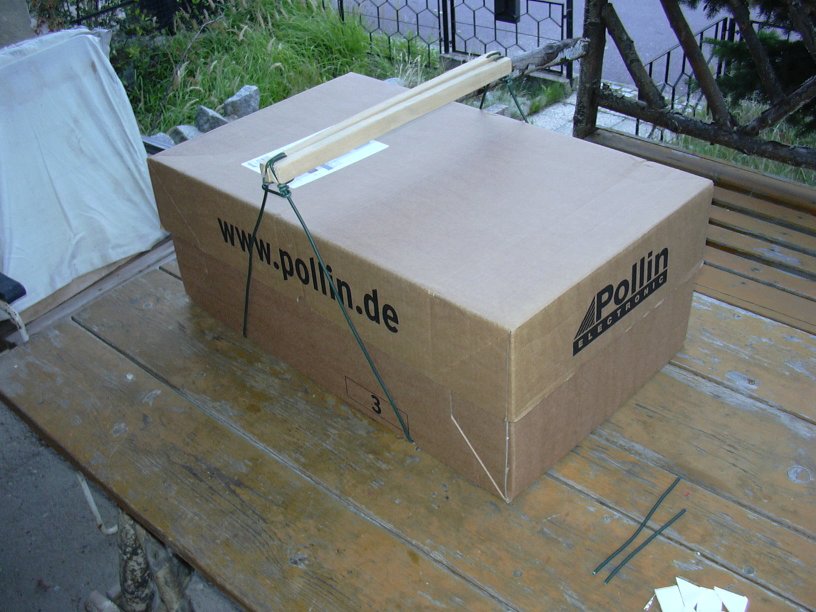 Zum Transport fehlte noch ein "tragbarer" Karton. Deshalb wurde ein halbwegs passender Karton verstärkt und mit Tragegriffen ausgestattet. Damit die Griffe nicht bei jedem Loslassen auseinander rutschen, lassen sie sich mit Haken zusammenklemmen.