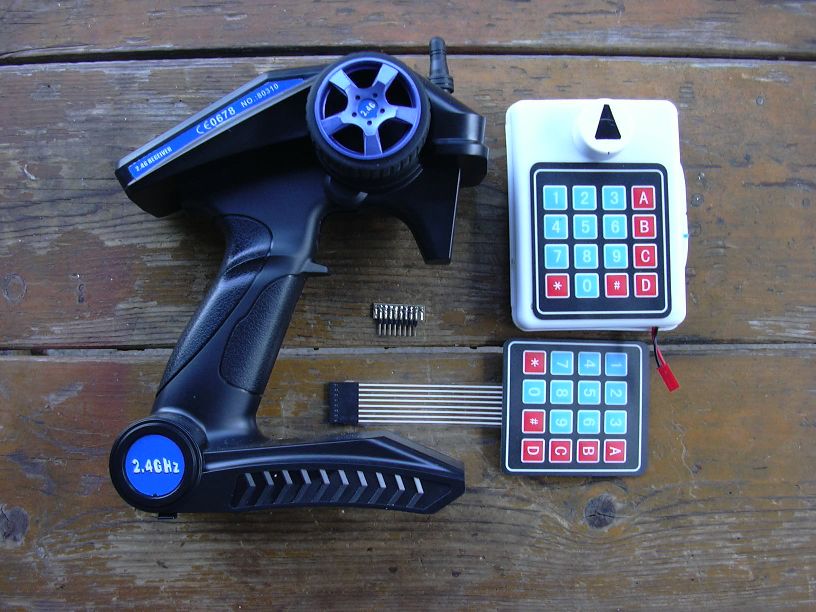 Dies ist das gute Stück... Links ist das Originalgehäuse, rechts oben die jetzige Version, dazwischen sind die verwendete Folientastatur und die Widerstandskombination dafür zu sehen. Es handelt sich um eine RC-Anlage mit nur 2 Kanälen, die für die Steuerung von Rennautos und Rennbooten vorgesehen war. Da ein Kanal für die Tastatur zum Ein/Ausloggen und der Bedienung der Zusatzfunktionen benötigt wird, bleibt nur ein Fahrkanal übrig. Daher bekommt der Gartenbahn-Handsender auch nur ein Poti (mit Mittenrastung) zum Steuern einer Lok. Zukünftig sollen die Handsender mit 2 Fahrpotis ausgestattet werden, sofern die RC-Sender die Möglichkeit bieten, einen dritten Kanal propotzional zu modulieren.