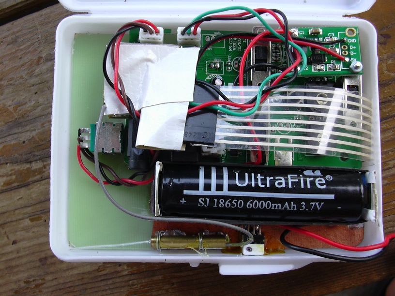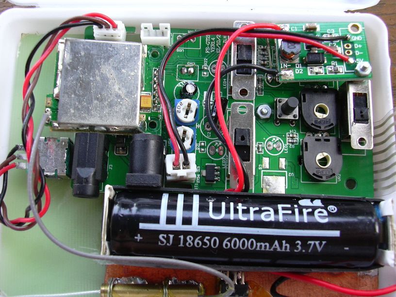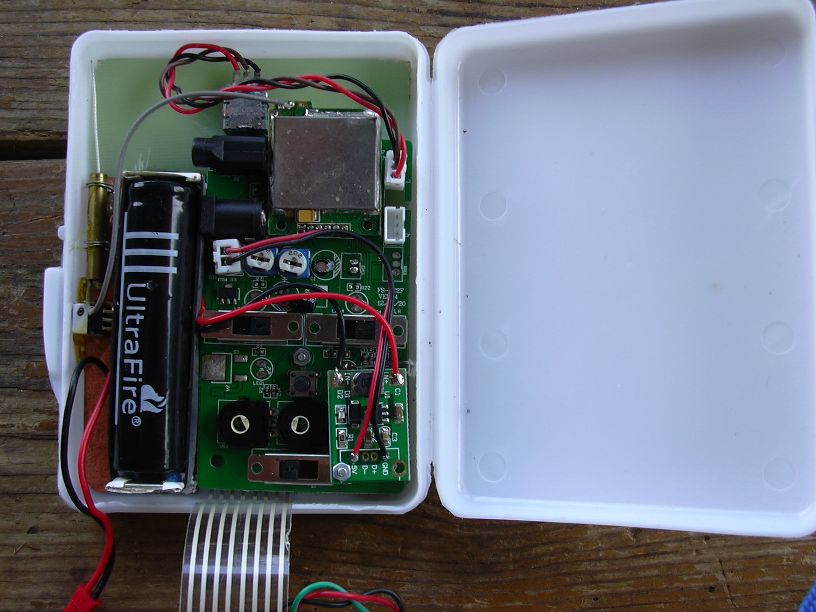 Die Platine des Fernsteuersenders wurde hier und da etwas zurechtgestutzt und mithilfe einer Trägerplatte aus FR4 in diese handliche Kunststoffschachtel eingesetzt. Am oberen Poti-Anschluss sieht man das Kabel zum Drehpoti (mit Mittelrastung), das direkt in der Frontplatte montiert ist. Dieses Poti dient zum Steuern von Tempo und Fahrtrichtung. An den unteren Potianschluss wird die Folientastatur (über die Widerstandskombination) angeschlossen, die auf diesem Foto wegen der besseren Sicht nach unten aus dem Bild geschwenkt wurde. Die Stellhebel der Schiebeschalter wurden abgekniffen, da sie sehr lang waren und sowiso nicht mehr verstellt werden. Unten rechts sieht man einen StepUp-Schaltregler, der aus der Spannung der 18650er Li-Ion-Zelle die Versorgungsspannung von 5,0V für die Platine bereitstellt. Links neben der Li-Ion-Zelle ist die Antenne platziert. Später wird entschieden, ob stattdessen eine externe WLAN-Antenne angebaut wird.