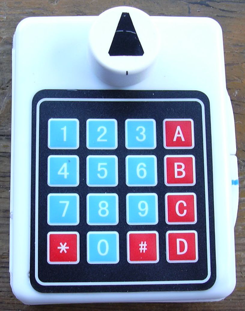 Der Handsender von außen, das Blaue am rechten Rand ist der Batterieschalter: