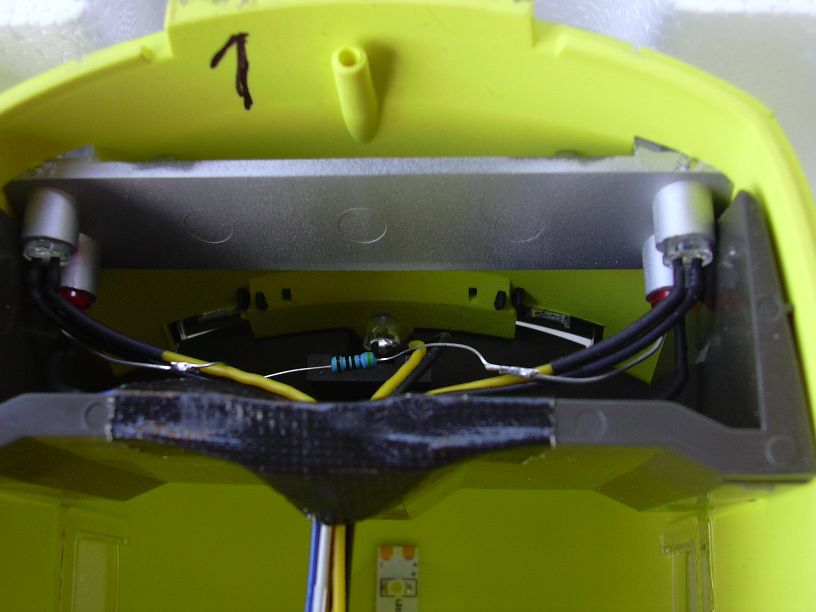 Dabei wurden beide LEDs in Reihe geschaltet, der Vorwiderstand kam dann einfach zwischen beide LEDs. Das Bild zeigt Führerstand 1 (vorn).