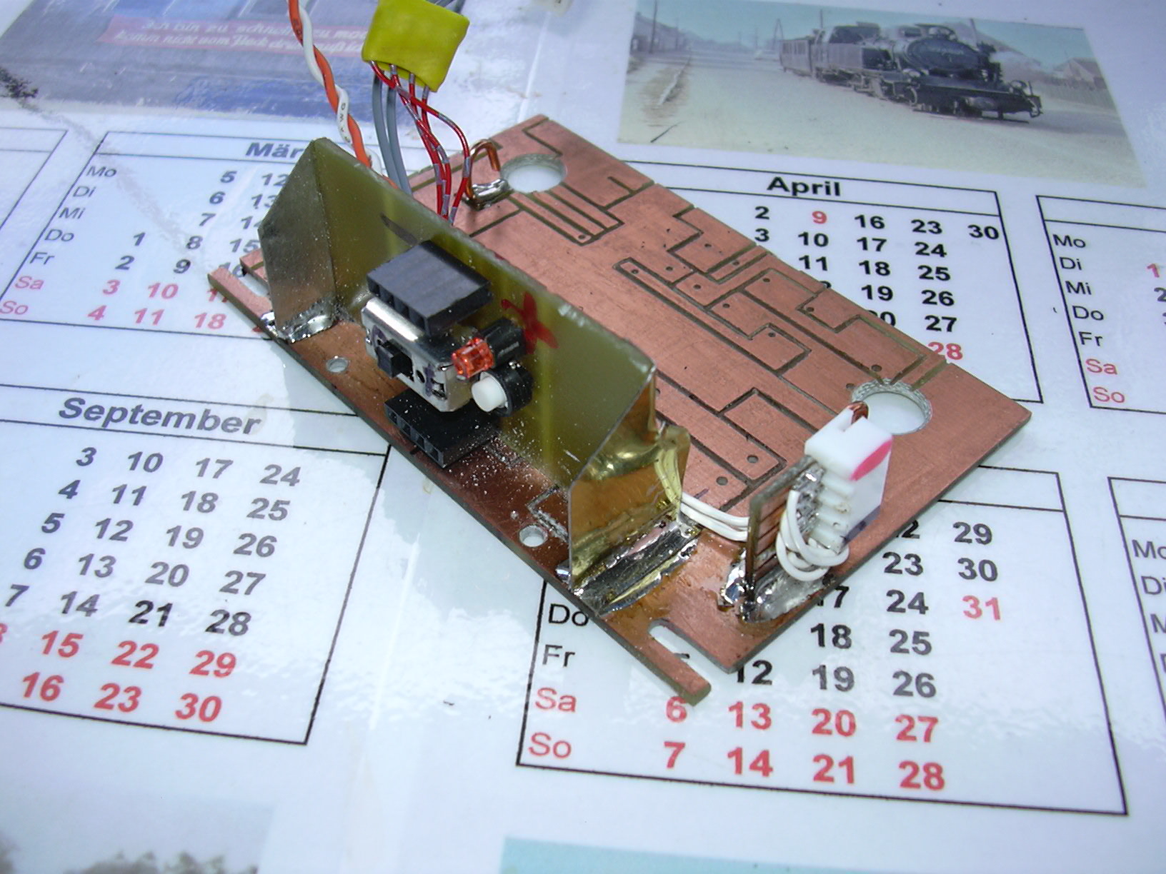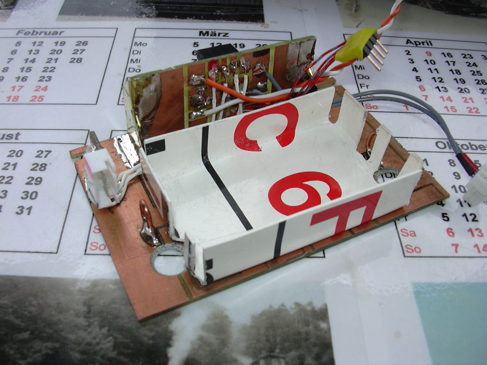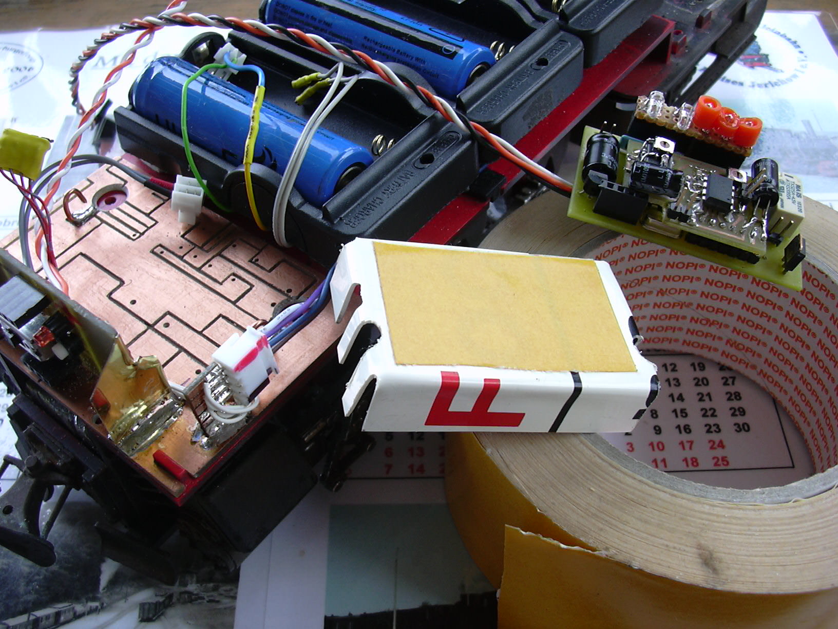 Zur isolierenden Aufnahme der Lok-Fahrtregler-Platine wurde aus 1mm-PVC (altes Zuglaufschild der DB) ein "Bettchen" gefertigt. Dies wird nun mit Teppich-Klebeband auf der Grundplatte befestigt.