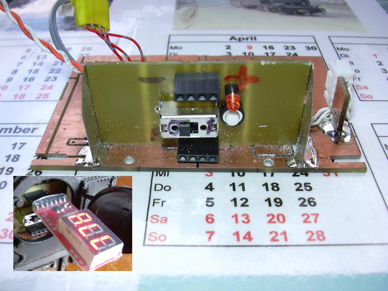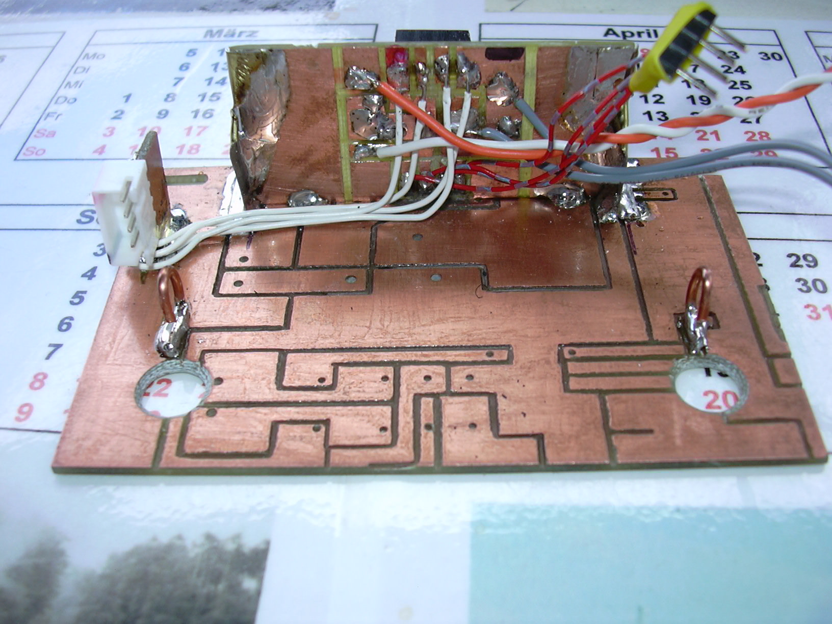 Ein Stück Platinenmaterial, das zwar schon für irgendeinen Zwck gefräst und gebohrt wurde, aber nie bestückt wurde, wurde als Trägerplatte genutzt. Darauf wurde mittels solider Knotenbleche die einseitige (geflexte) Bedienplatine befestigt. Ein Stück doppelseitiges Platinenmaterial trägt den Steckverbinder für den Akku.