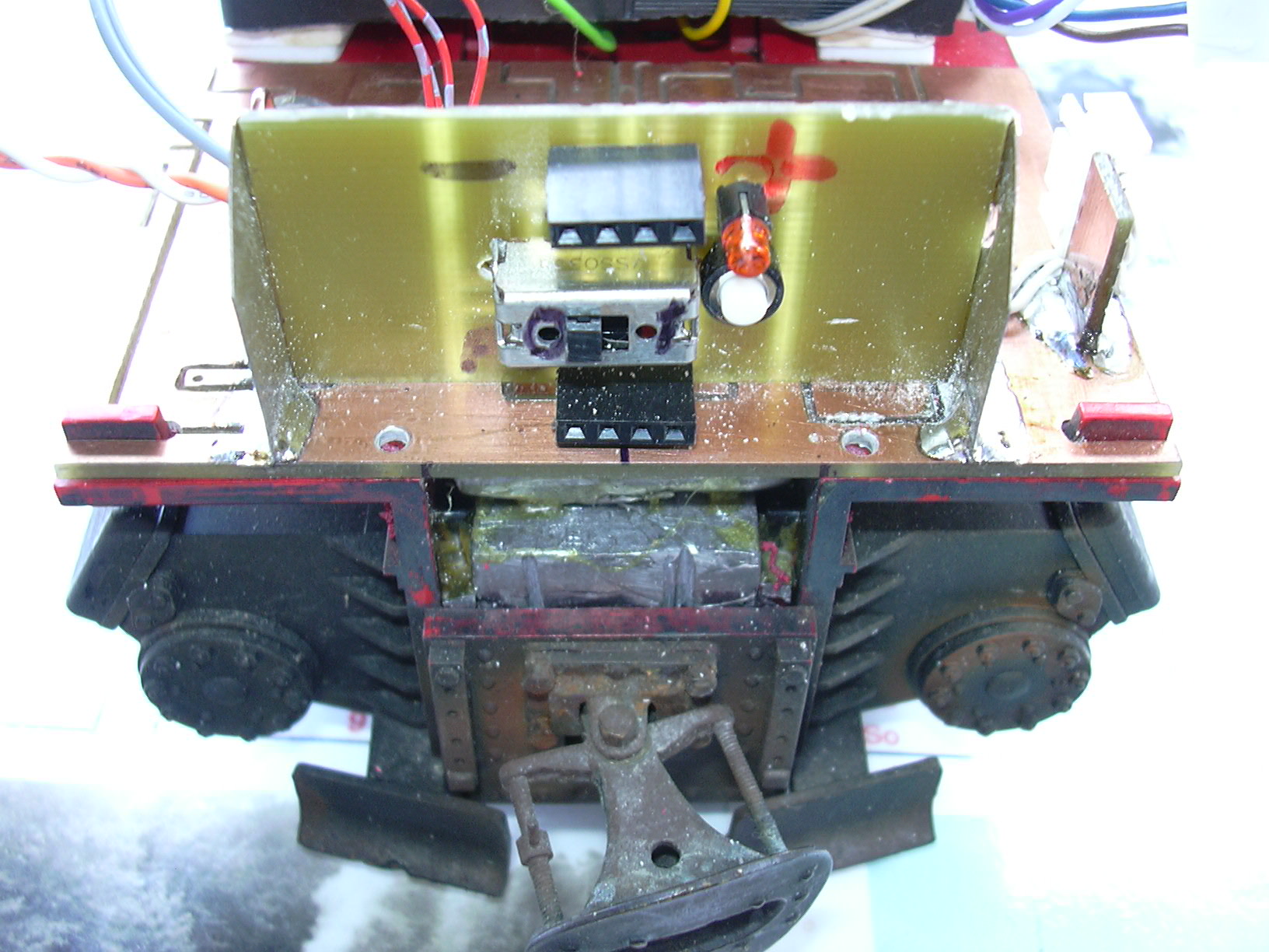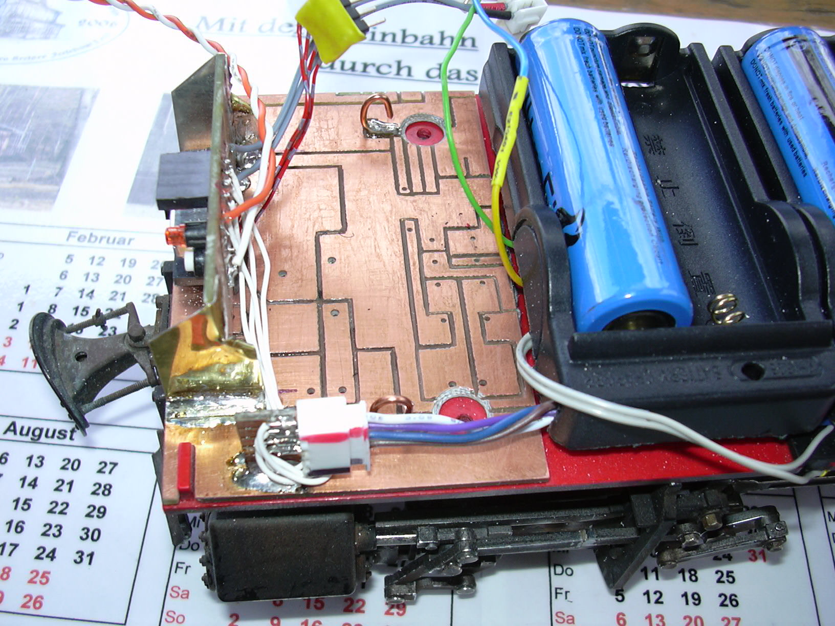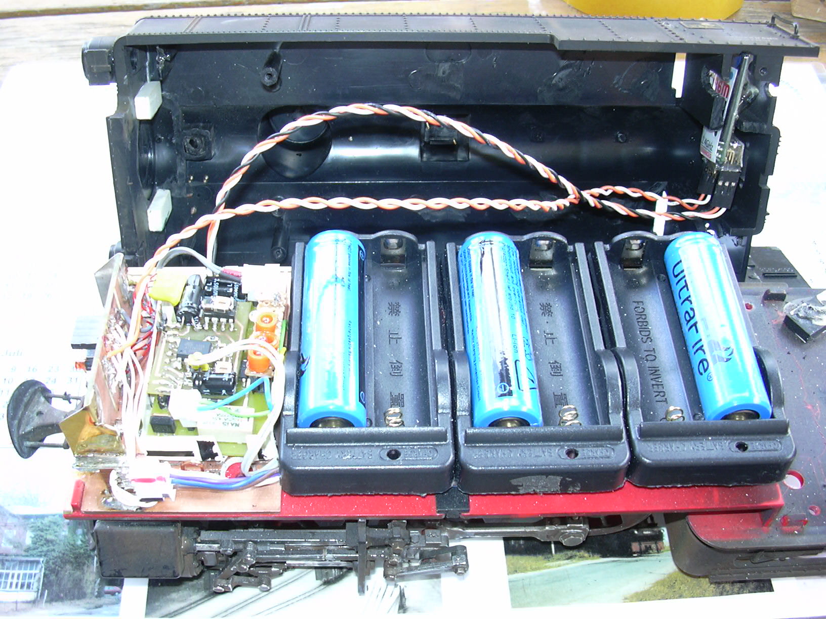 Sicht von der anderen Seite. Die Strippen werden dann im Kessel oberhalb der Akkus verlegt. Da kommen dann ja auch noch die Strippen für Licht und Lautsprecher dazu.