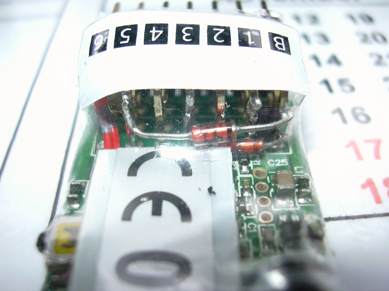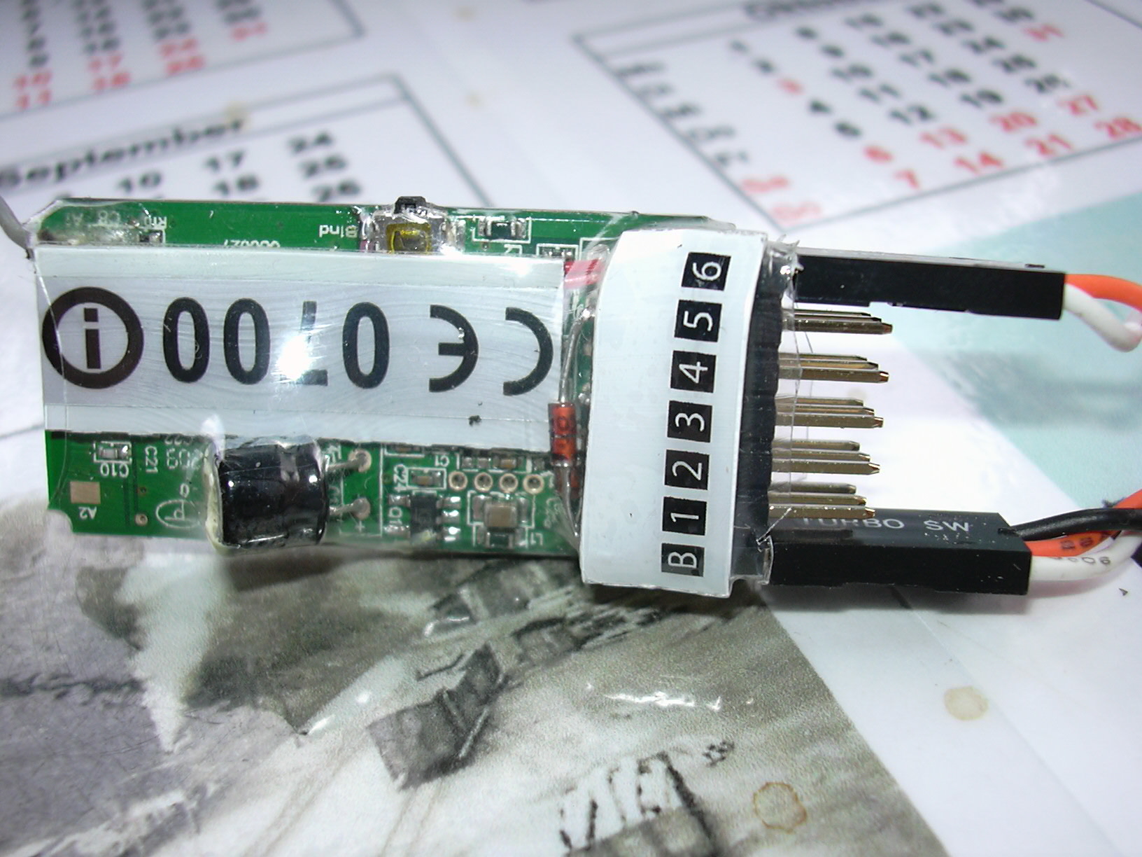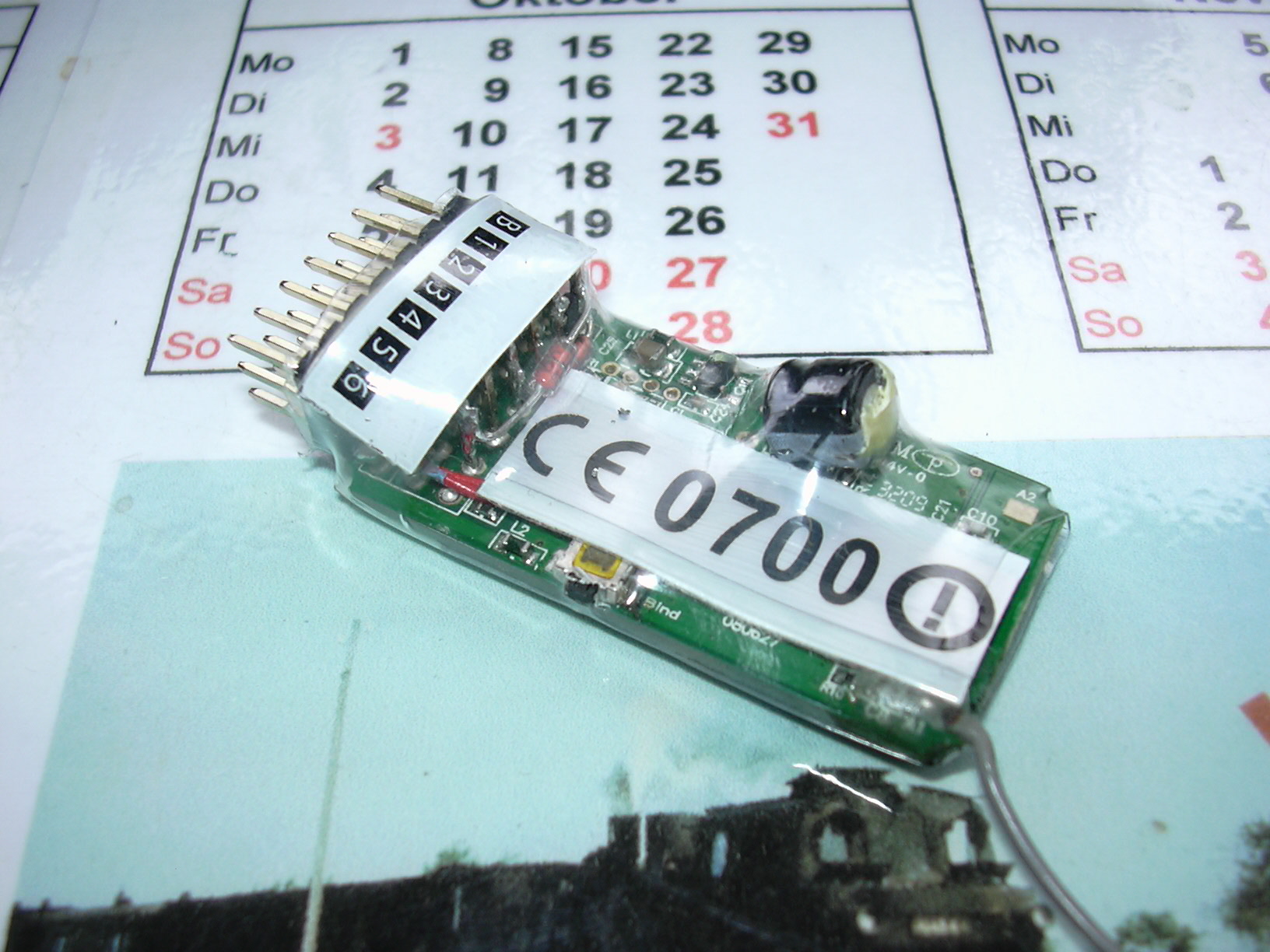 Die andere Seite des Funkempfängers. Am Taster wurde ein Loch in den Schrumpfschlauch geschnitten.