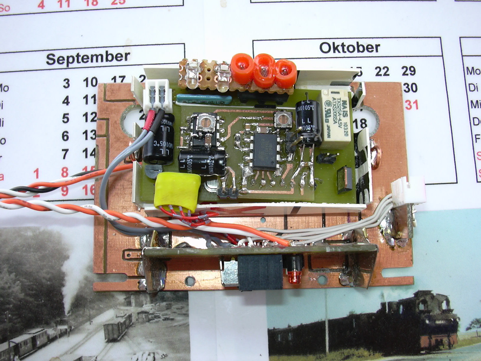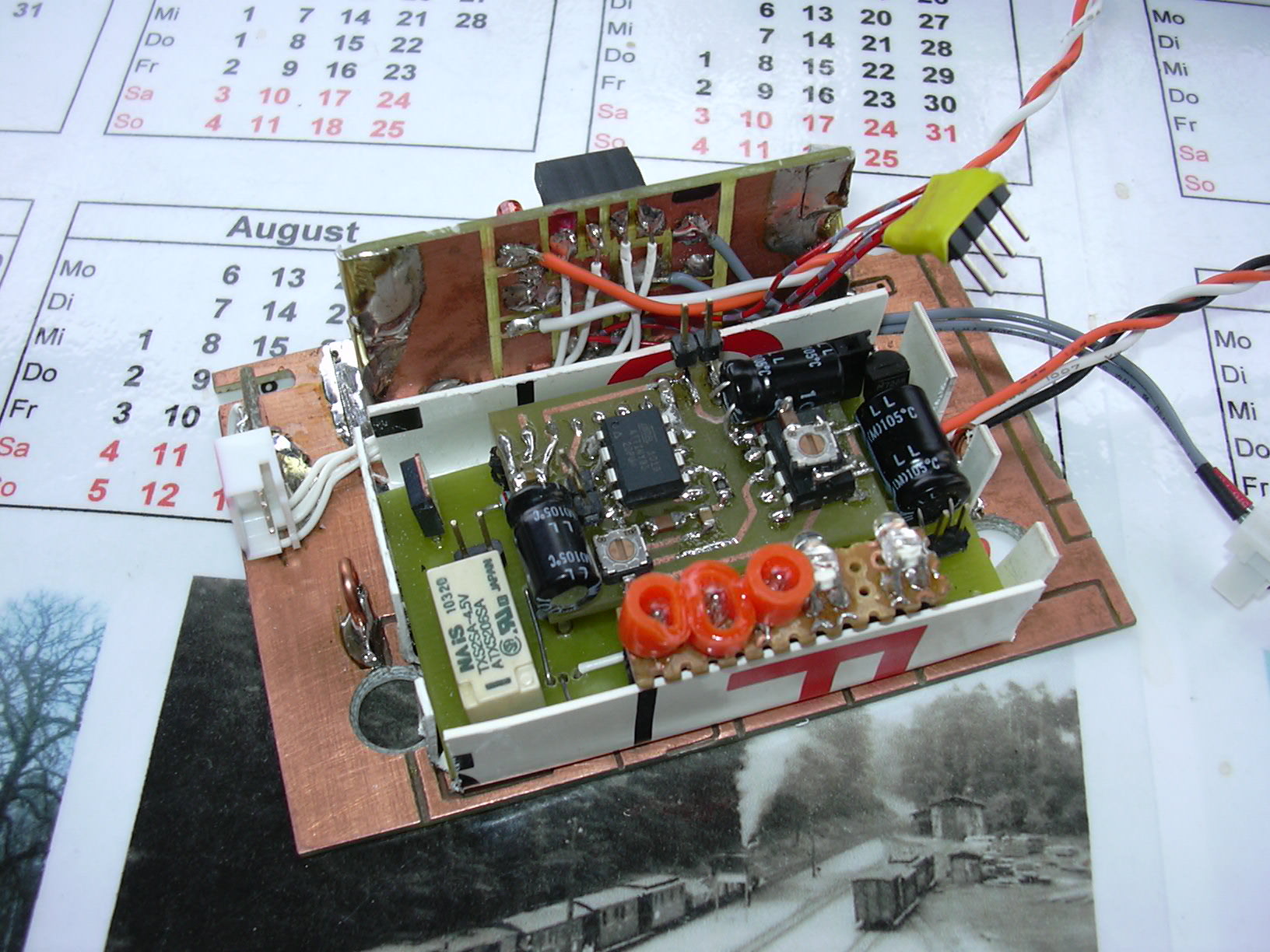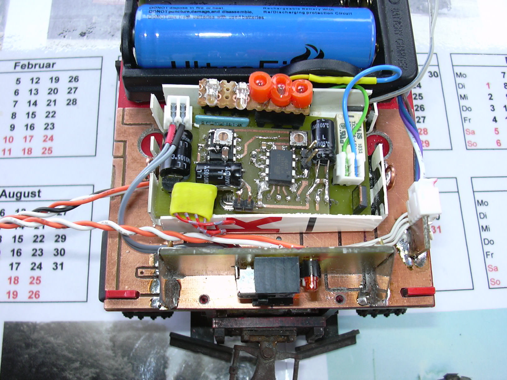 Die beiden roten Strippen links sind für den Anschluss der externen Bedieneinheit (Taster, LED). Zum rechten Anschluss (Batterie-Anschluss) führen die 3 Dioden, die die Impulse der Kanäle 1, 3 und 5 zusammenfassen. Dies erspart eine externe Platine am Steckverbinder des Empfängers.