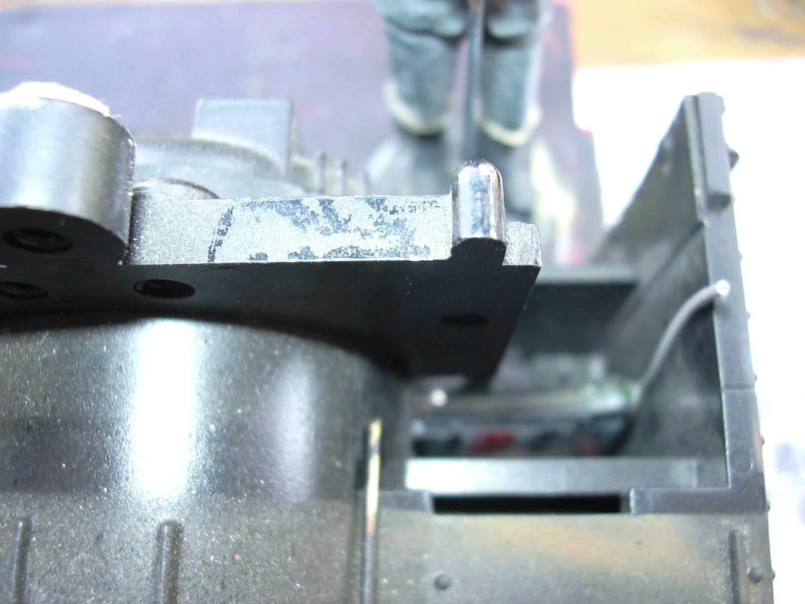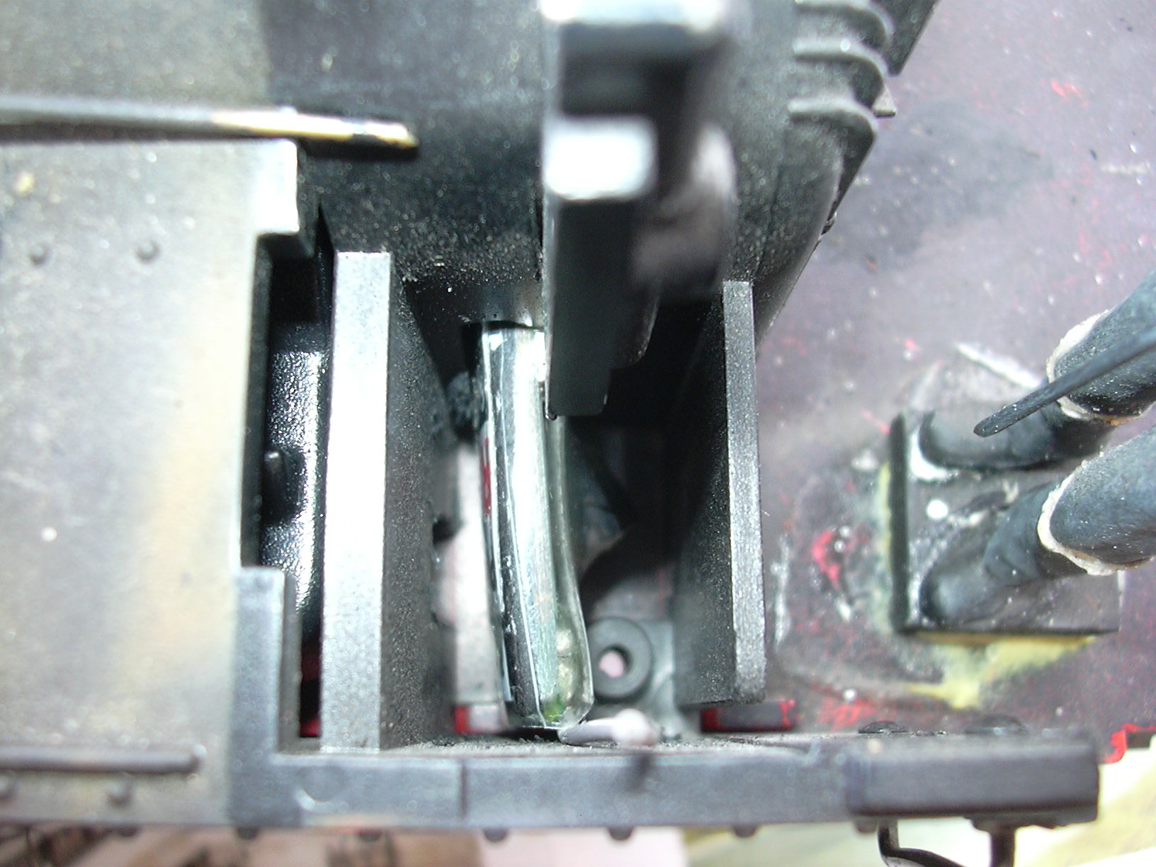Da vorn kein Platz mehr war, wurde der Funk-Empfänger in die Feuerbüchse vebannt. Dazu wurde mit der 12V-Flex ein Schlitz in den Gehäusespanten eingeschnitten.