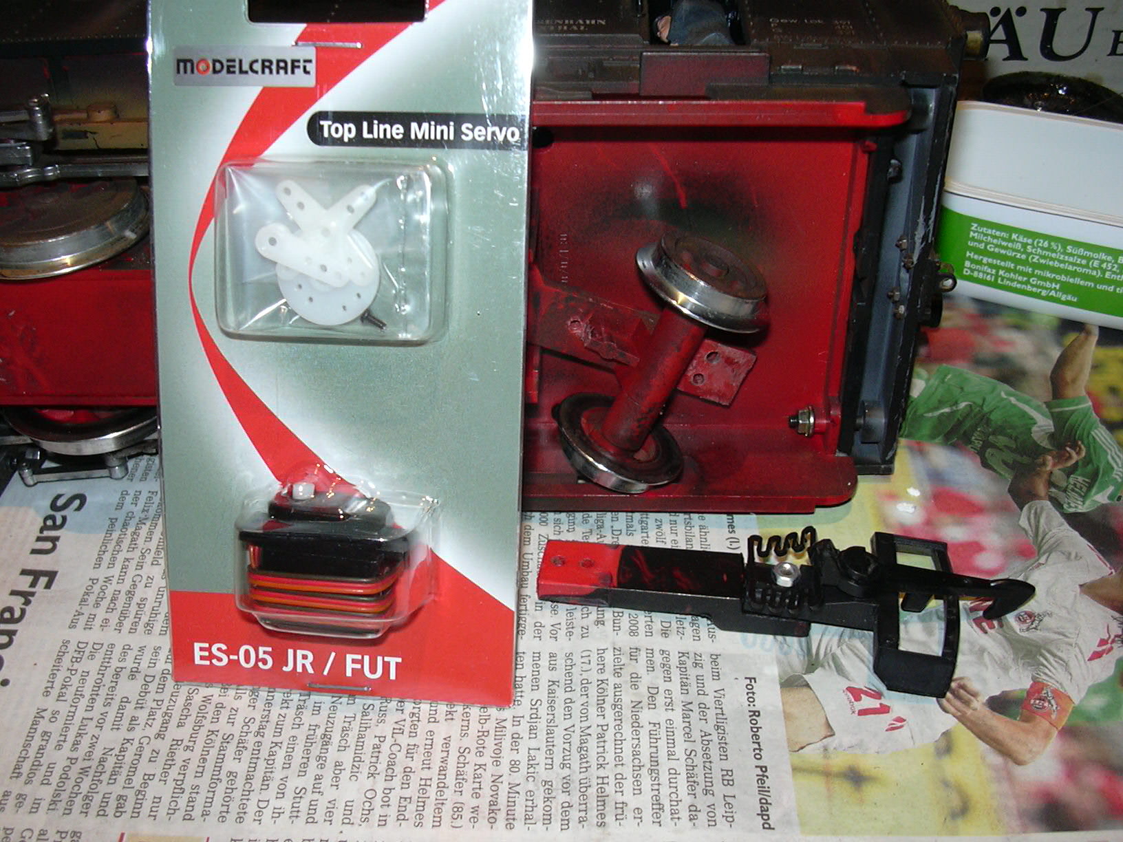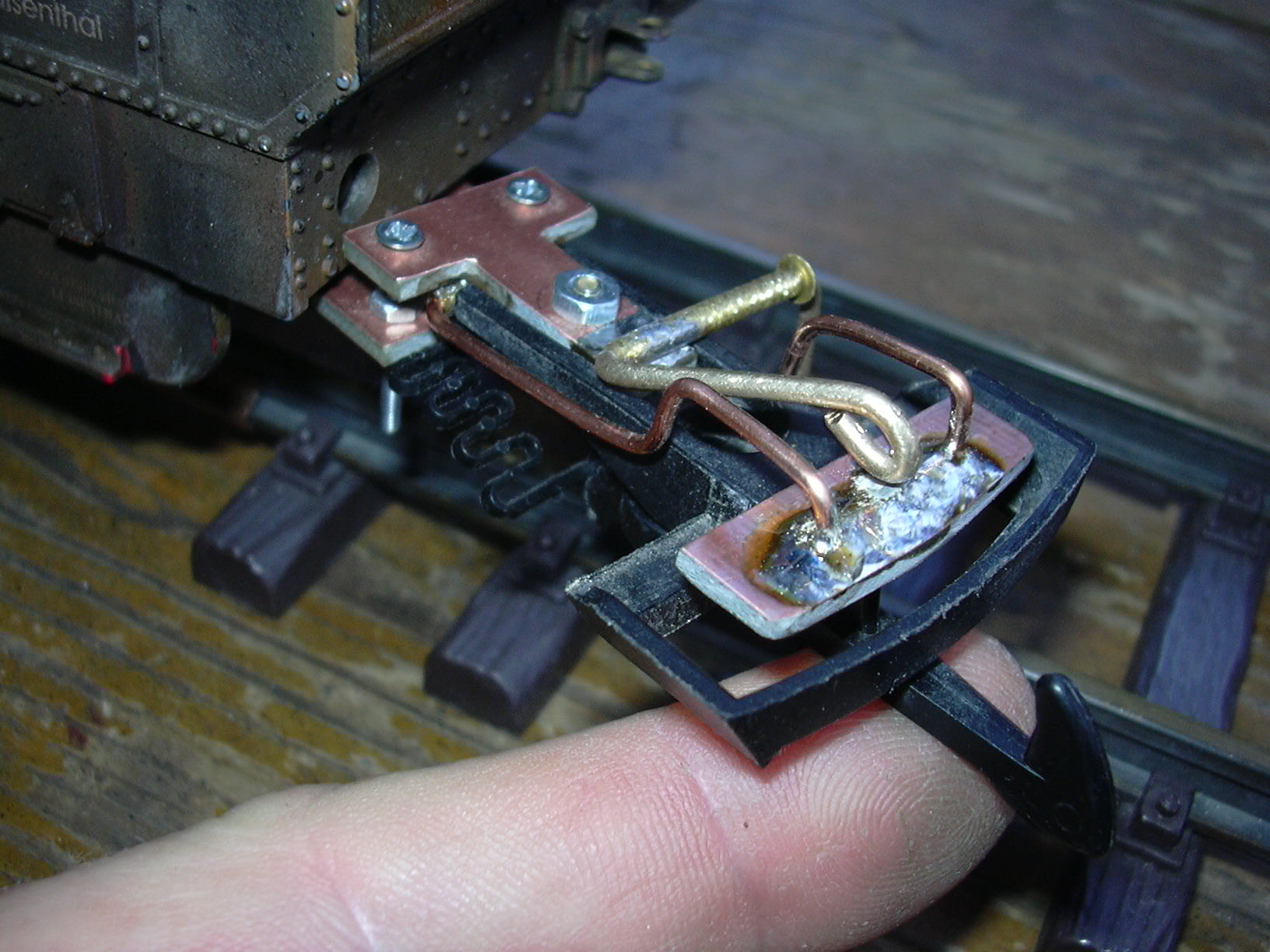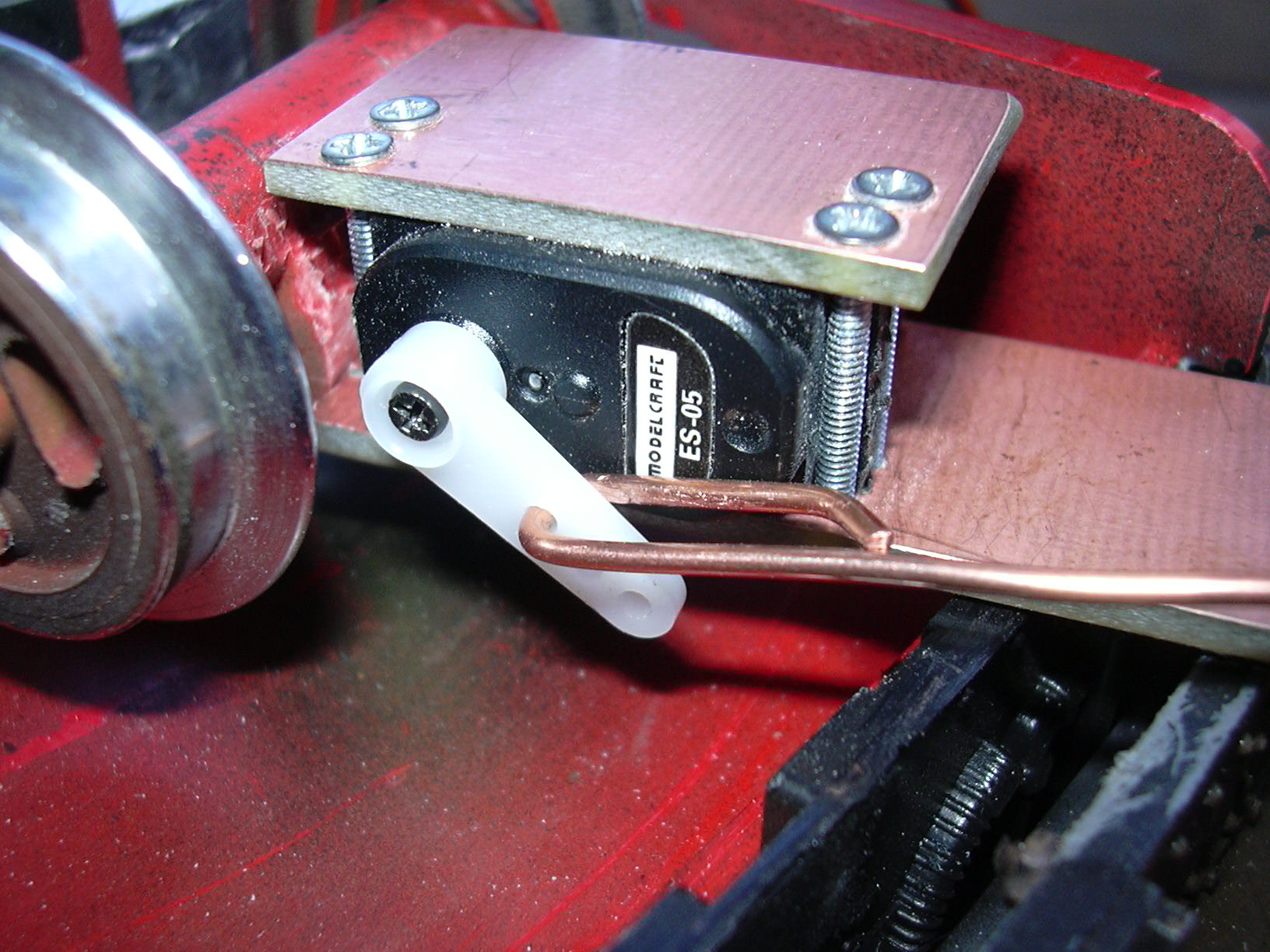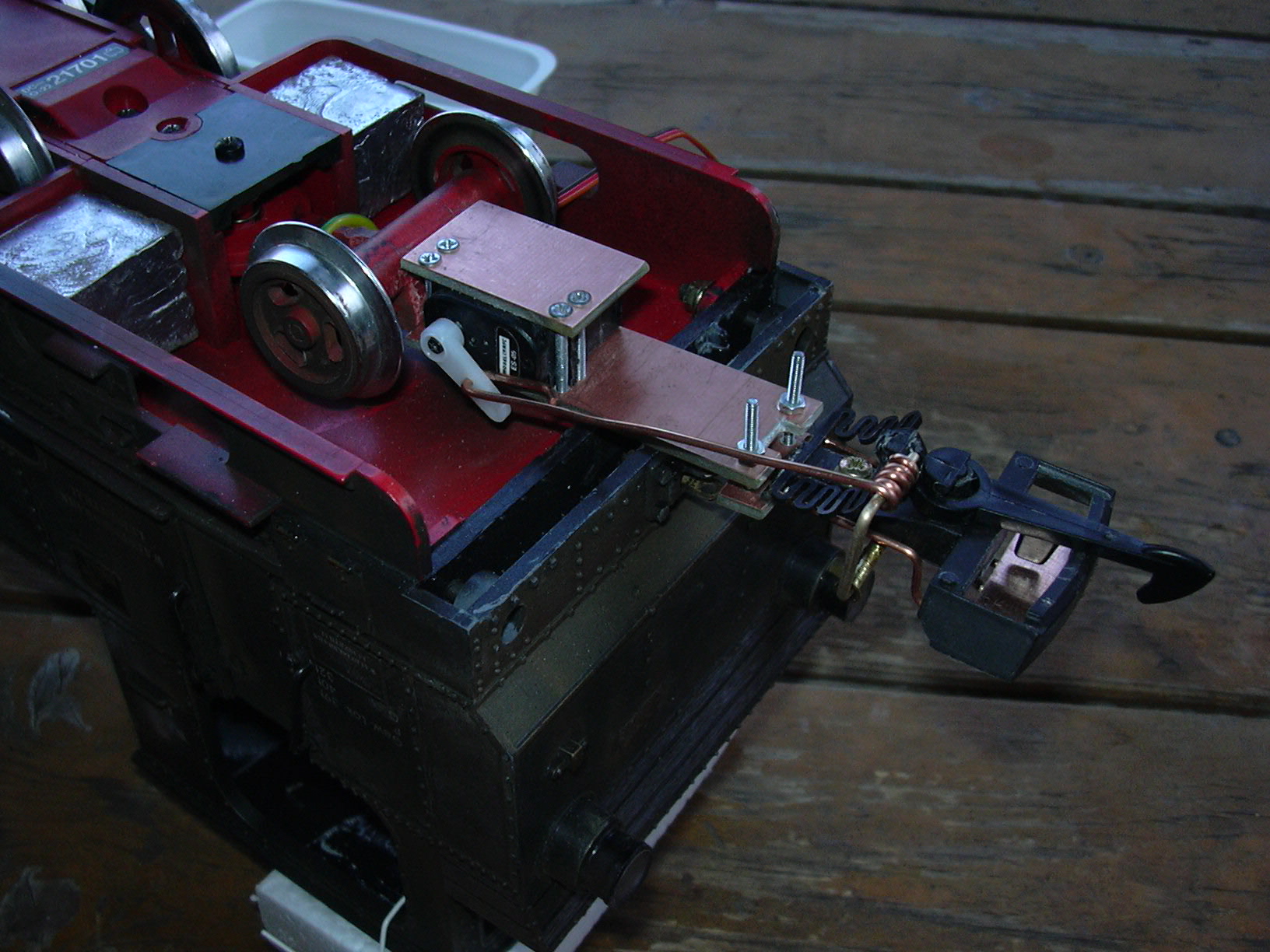 Auf ihm wurde mit einer zweiten Platte und 4 Schrauben M2 das Servo befestigt. Die Kraftübertragung zur Entlupplungs-platte übernimmt etwas Kupferdraht mit 1,5 mm Durchmesser (NYA 1,5 qmm), der bei meiner Einzeller-Stainz verwendete 0,4mm-Stahldraht erwies sich als zu schwach. Denn die Original-LGB-Kupplungsfeder braucht doch schon beachtliche Kraft zum Überwinden.