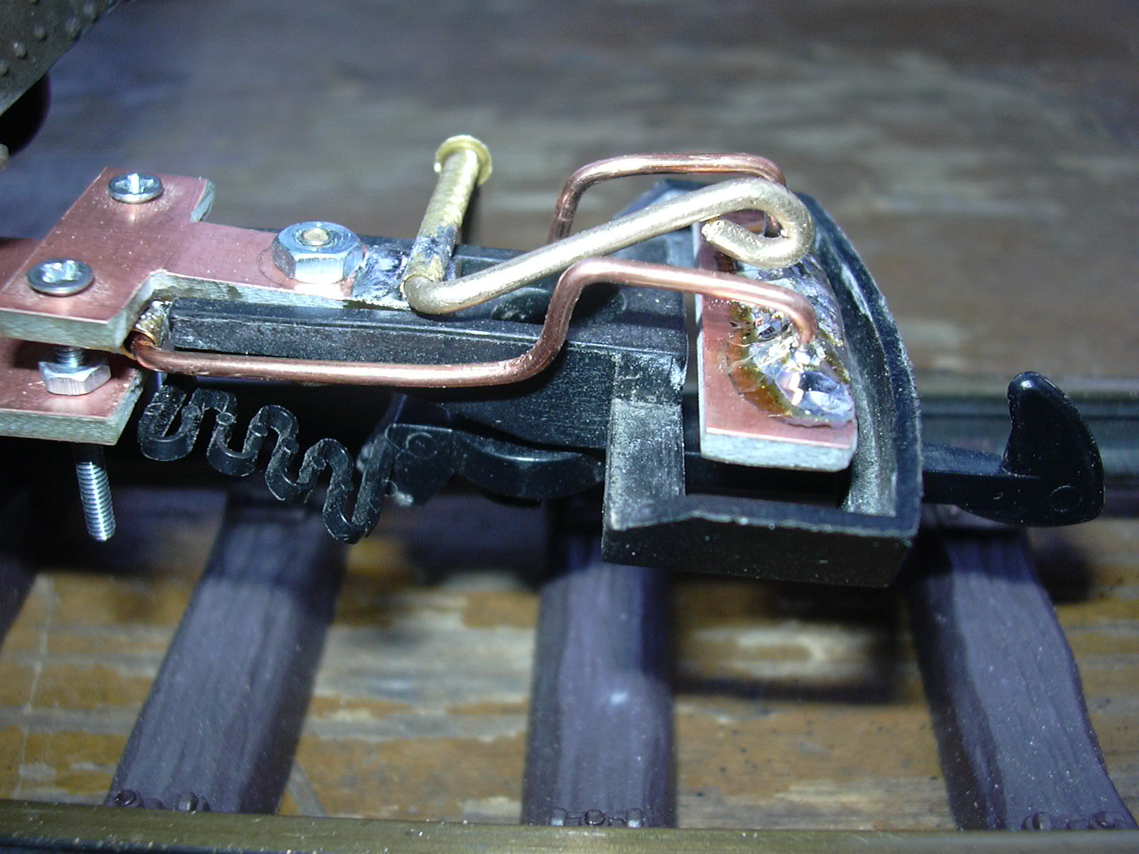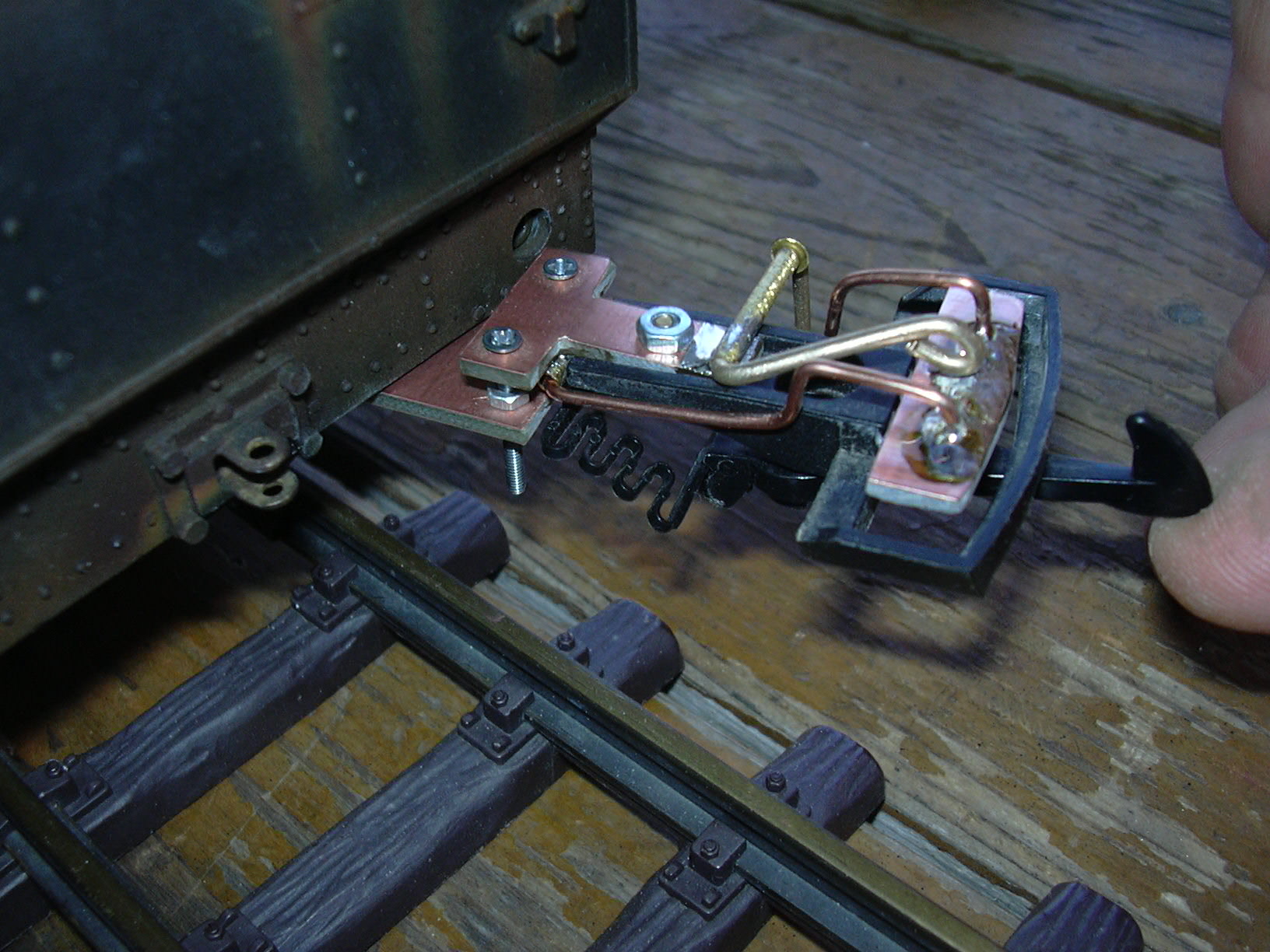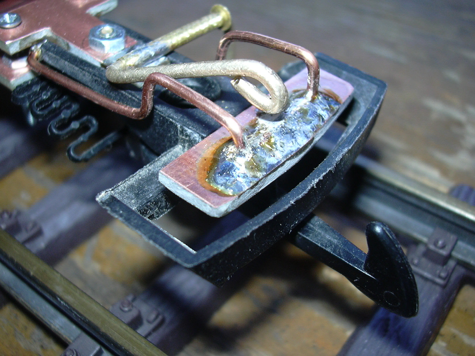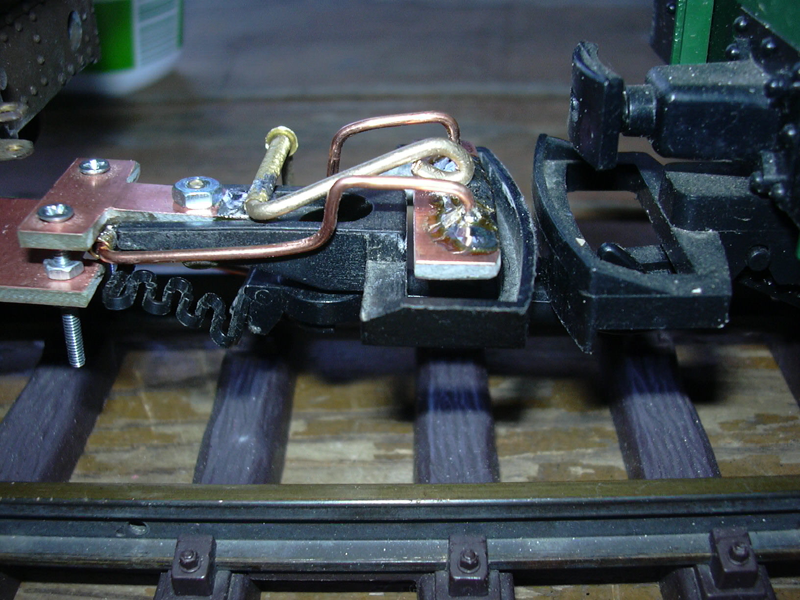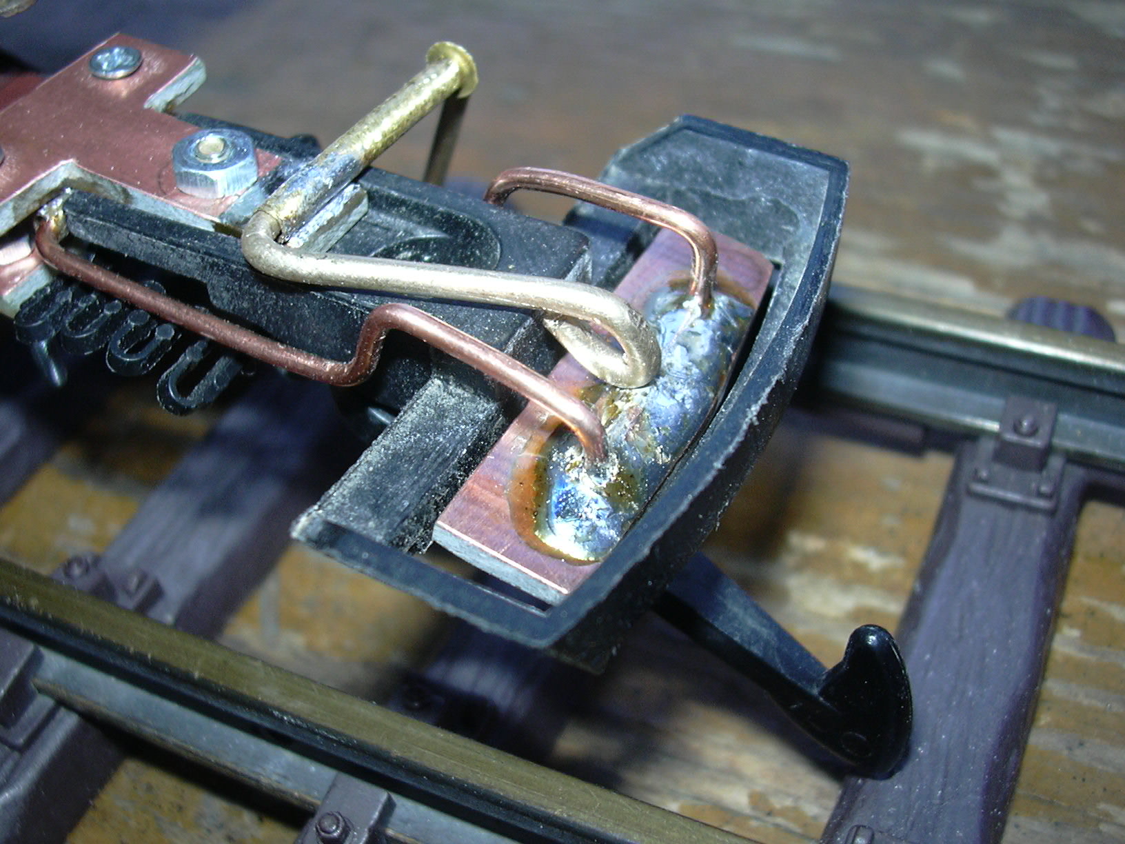Auf ihm wurde mit einer zweiten Platte und 4 Schrauben M2 das Servo befestigt. Die Kraftübertragung zur Entlupplungs-platte übernimmt etwas Kupferdraht mit 1,5 mm Durchmesser (NYA 1,5 qmm), der bei meiner Einzeller-Stainz verwendete 0,4mm-Stahldraht erwies sich als zu schwach. Denn die Original-LGB-Kupplungsfeder braucht doch schon beachtliche Kraft zum Überwinden.