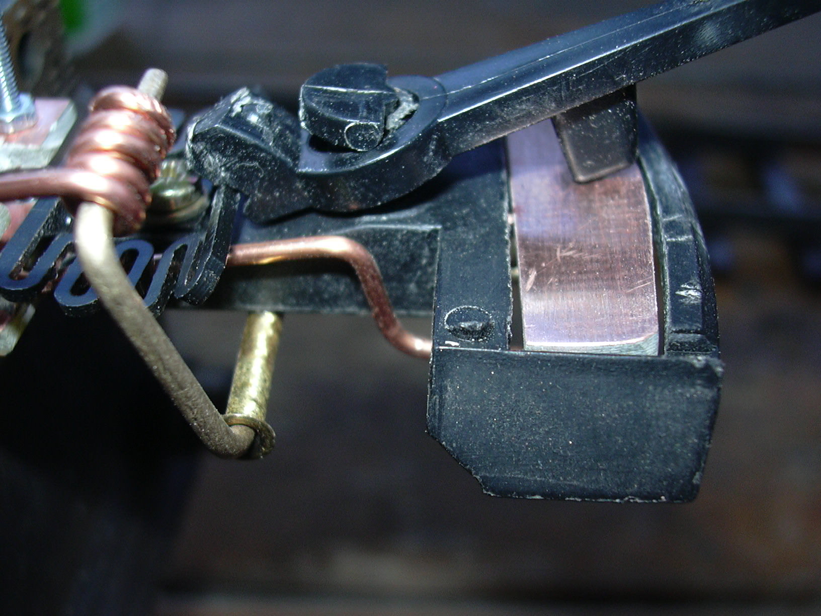 Die Ausdrückplatte kann an den Abwinklungen ihrer kupferdrahtigen Aufhängung in der Lage justiert werden. Die Ausdrück-Kraft wirkt über den Messing-Hebel auf die Mitte der Platte. Im Eingekuppelten Zustand ist etwas Platz zwischen Ausdrückhebel und Platte.