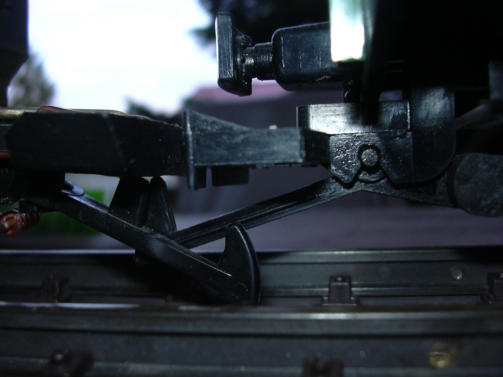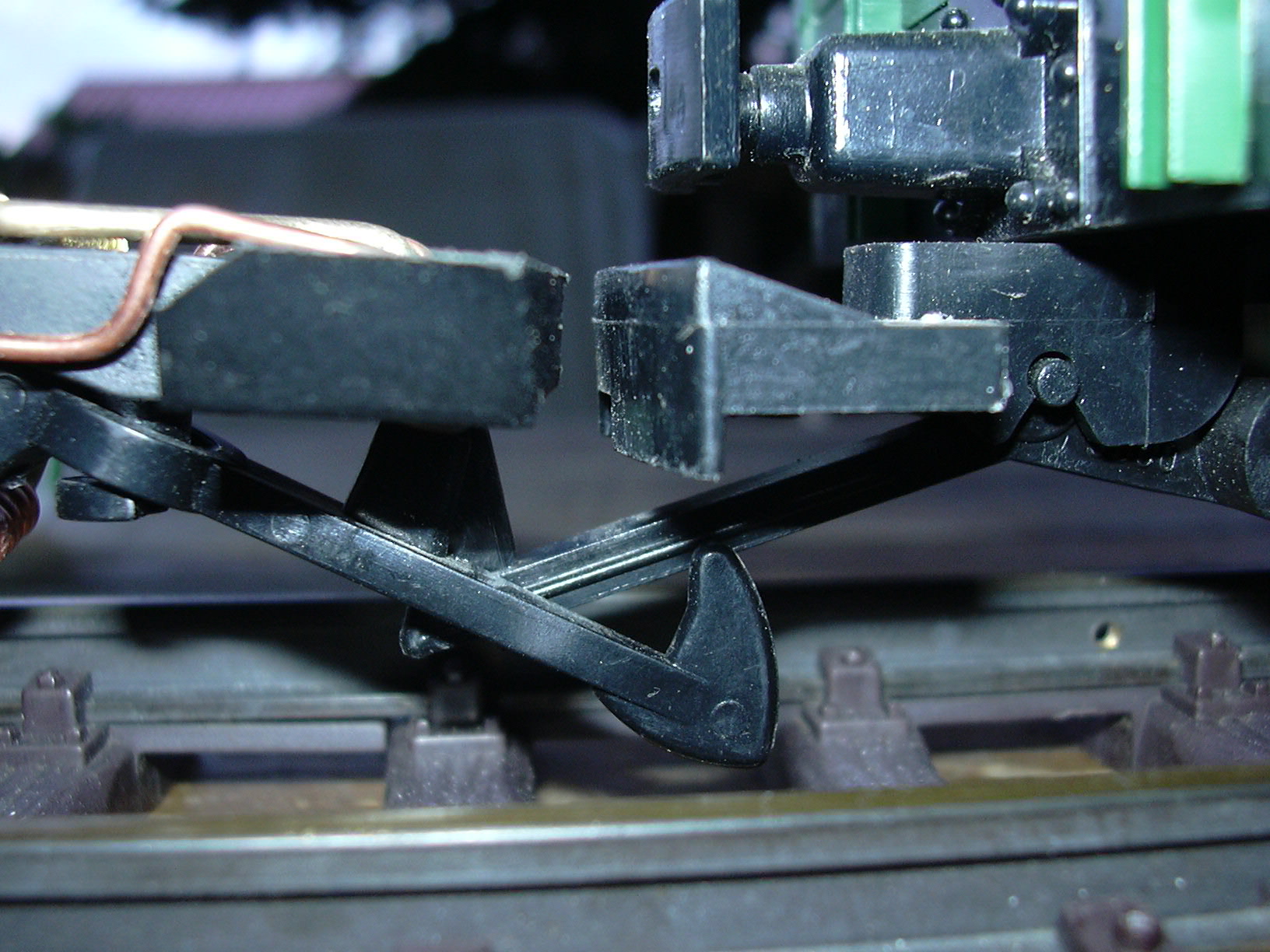 Im Ausgekuppelten Zustand drückt der Hebel die Platte so weit nach unten, dass die Kupplungshaken keinen Halt mehr im Kupplungsbügel finden.