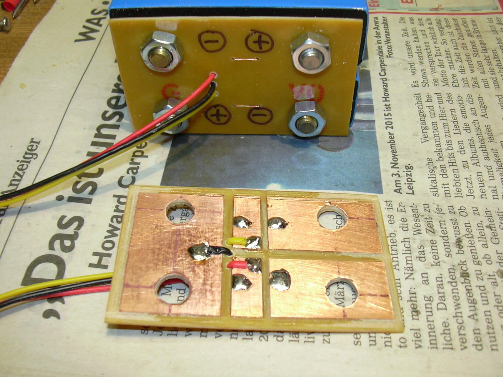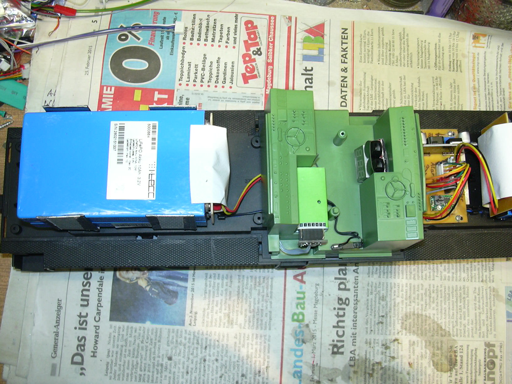 Im Hintergrund ist der Stepup-Schaltregler zu sehen, davor die Steckverbinder für Akku-Alarm (links), Ladebuchse (rechts), Akkuzellen (dazwischen) und Batterieschalter (davor, schwarz). Die Ausgangsleitungen zum Lokfahrtregler sind unter der Platine angelötet, sie werden ja am Lokfahrtregler gesteckt.