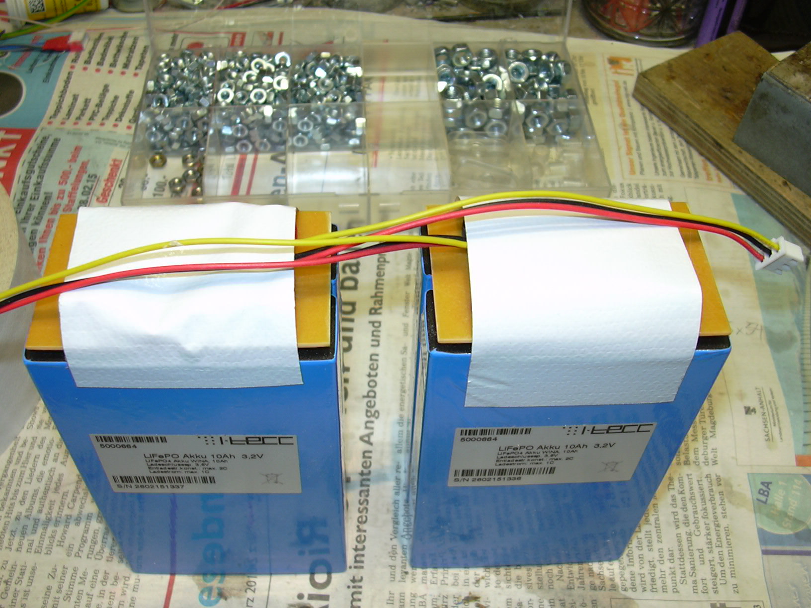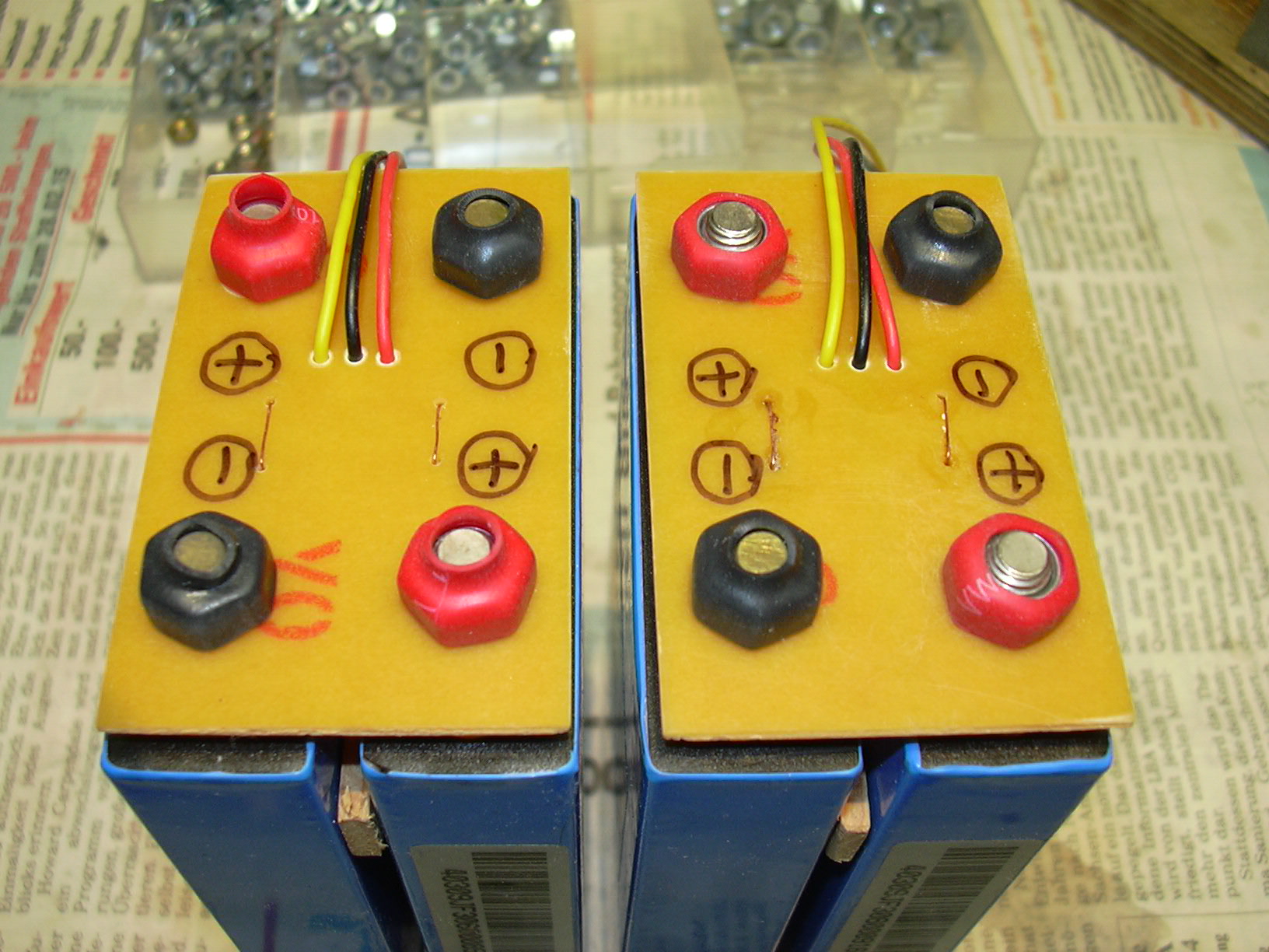 Es wurden 4 Lithium-Eisenphosphat-Akkuzellen je 3,2 V, 10 Ah mit M6-Anschlussbolzen eingesetzt. Je 2 Zellen teilen sich eine Kontakt-Platine, die neben der Kontaktierung noch für jede Zelle eine Schmelzsicherung in Form eines dünnen Opferdrahtes enthält. Von dort geht es mit zwei Balancerkabeln (2s) zur Stromverteilplatine. Dort werden beide 2s-Zellengruppen zu einer 4s-Batterie zusammengeschaltet. Parallel dazu liegt der Anschluss für die Ladebuchse. Der Plus wird über den Batterieschalter zum Anschluss für den Akku-Alarm und zu den beiden Schaltreglern geführt. Der Akku-Alarm wurde mit einer Elektronik zum allpoligen Trennen/Einschalten des Alarm-Moduls nachgerüstet, es muss also beim Abschalten nur der Plus abgeschaltet werden.