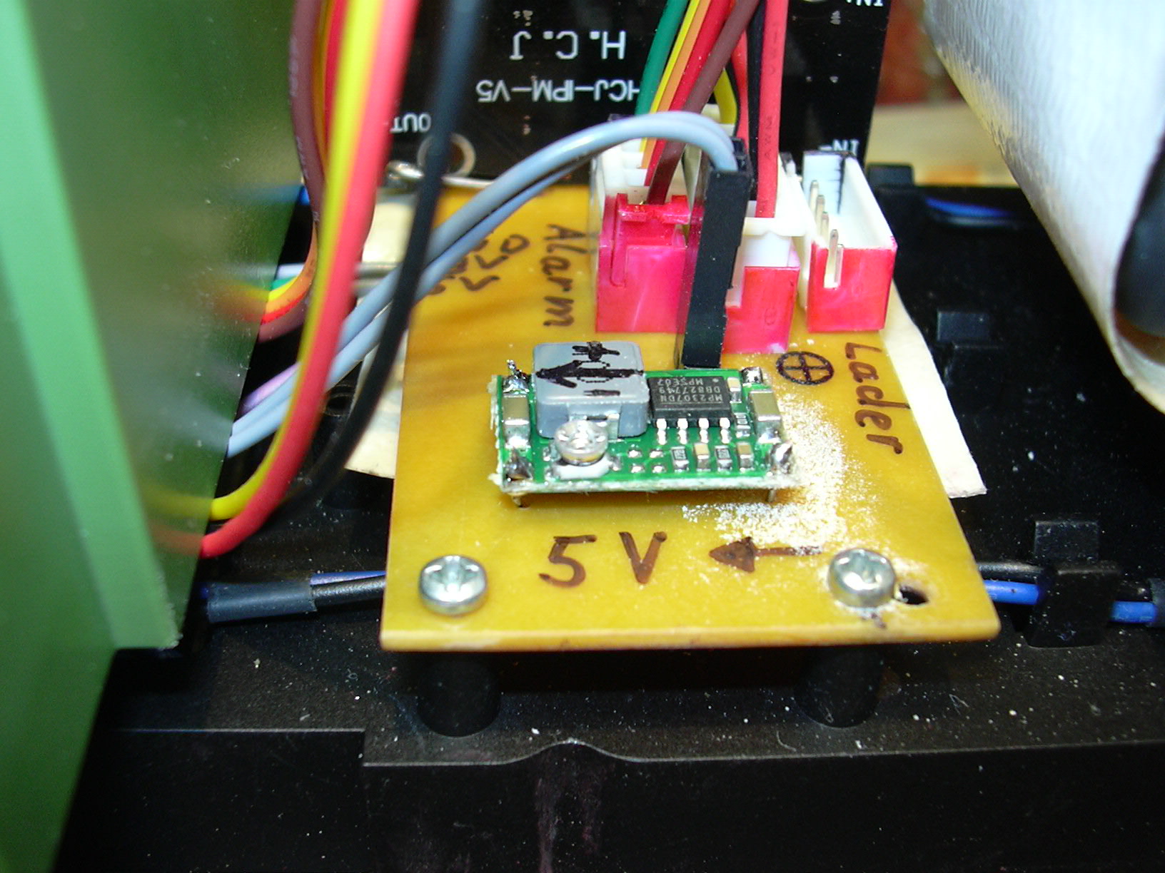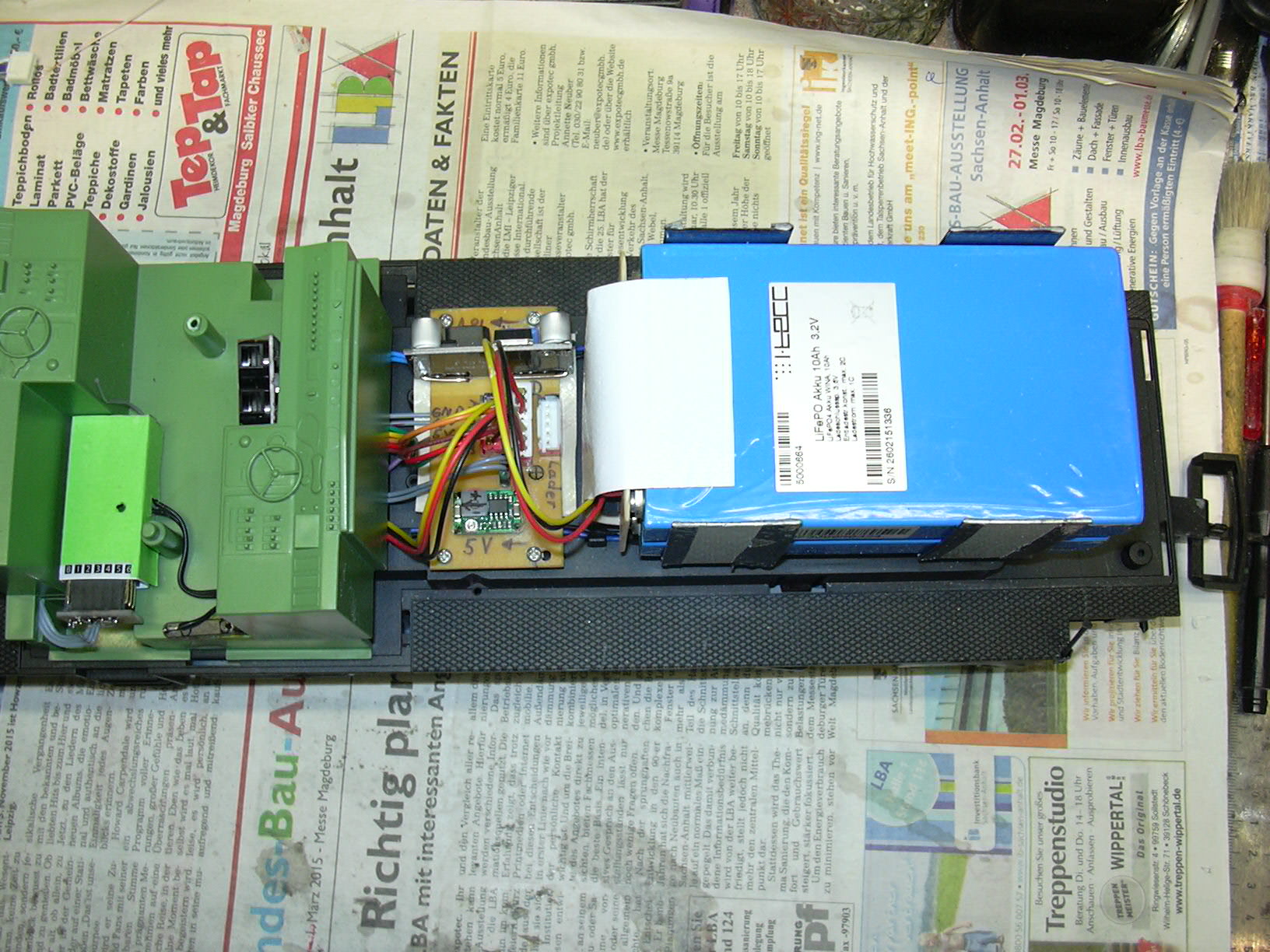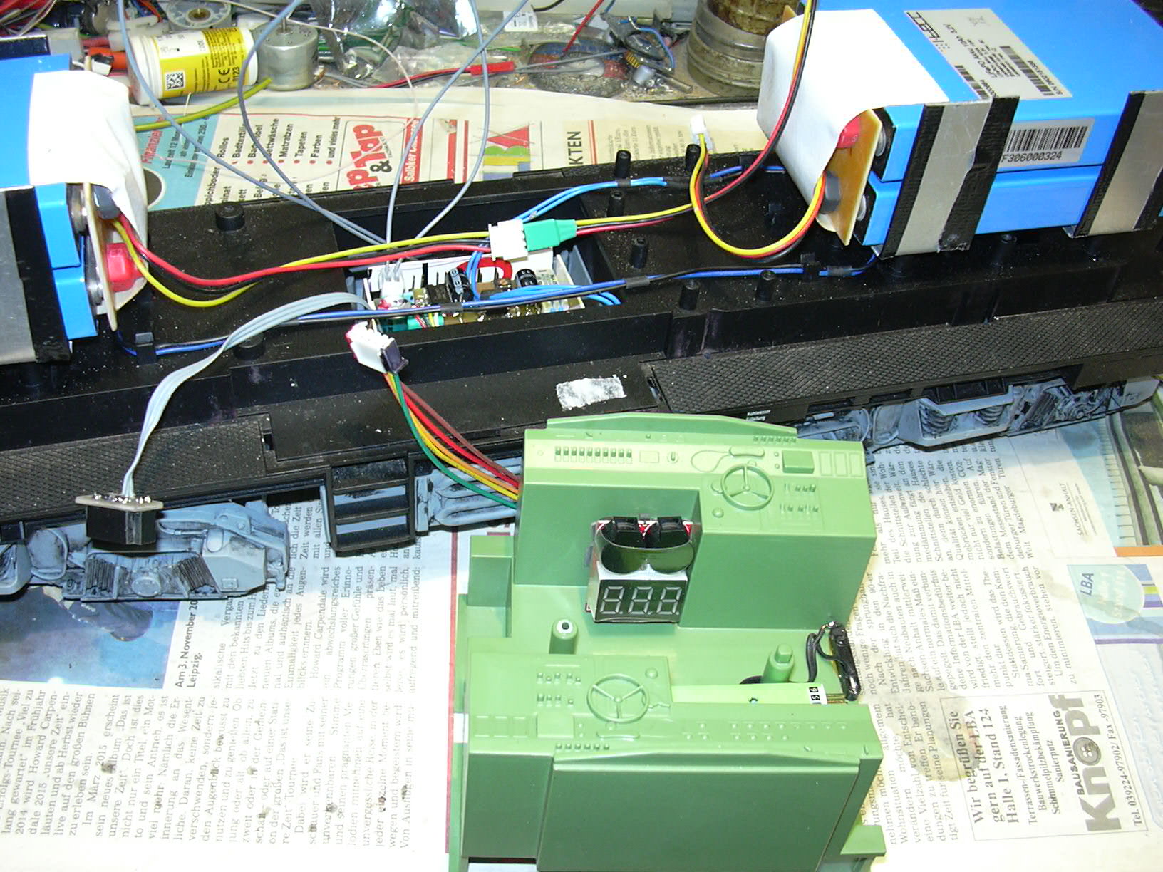 Die angelöteten Leitungen gehen zum Lokfahrtregler. Für Akkus, Ladebuchse, Akku-Alarm und Batterieschalter sind Steckverbinder eingelötet. Die Verdrahtung der Schaltregler wurde improvisiert.
