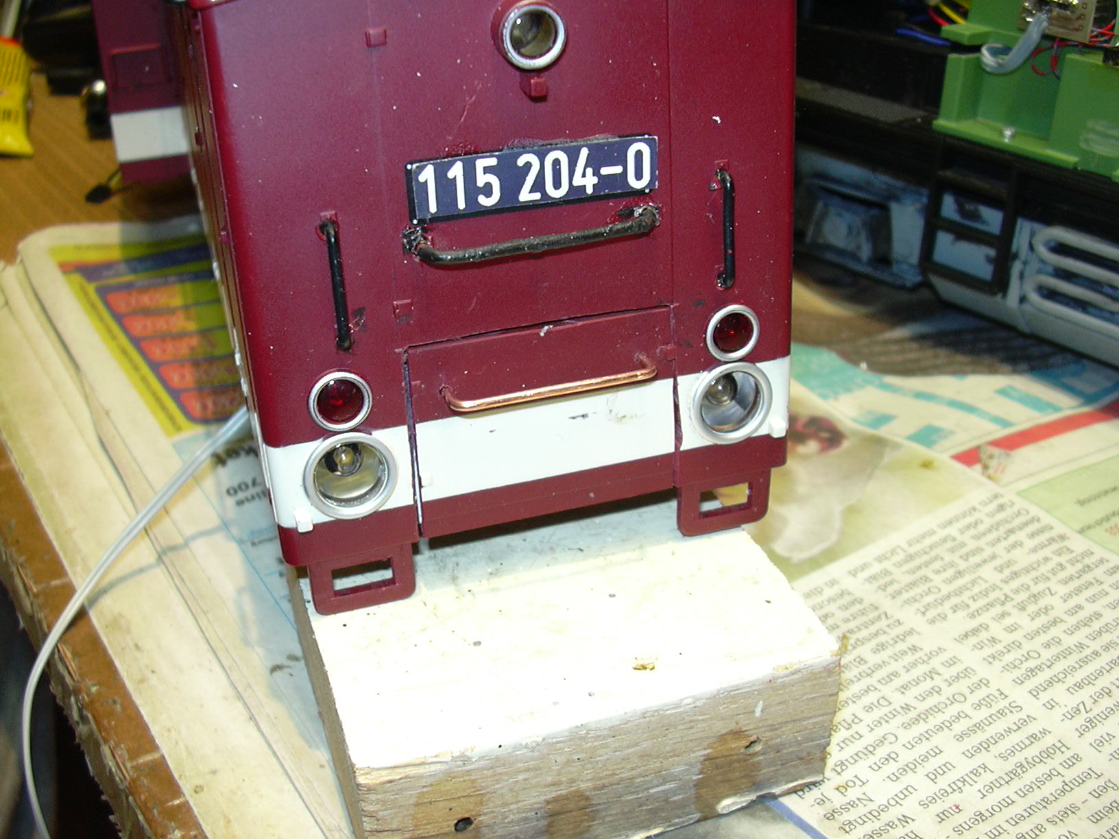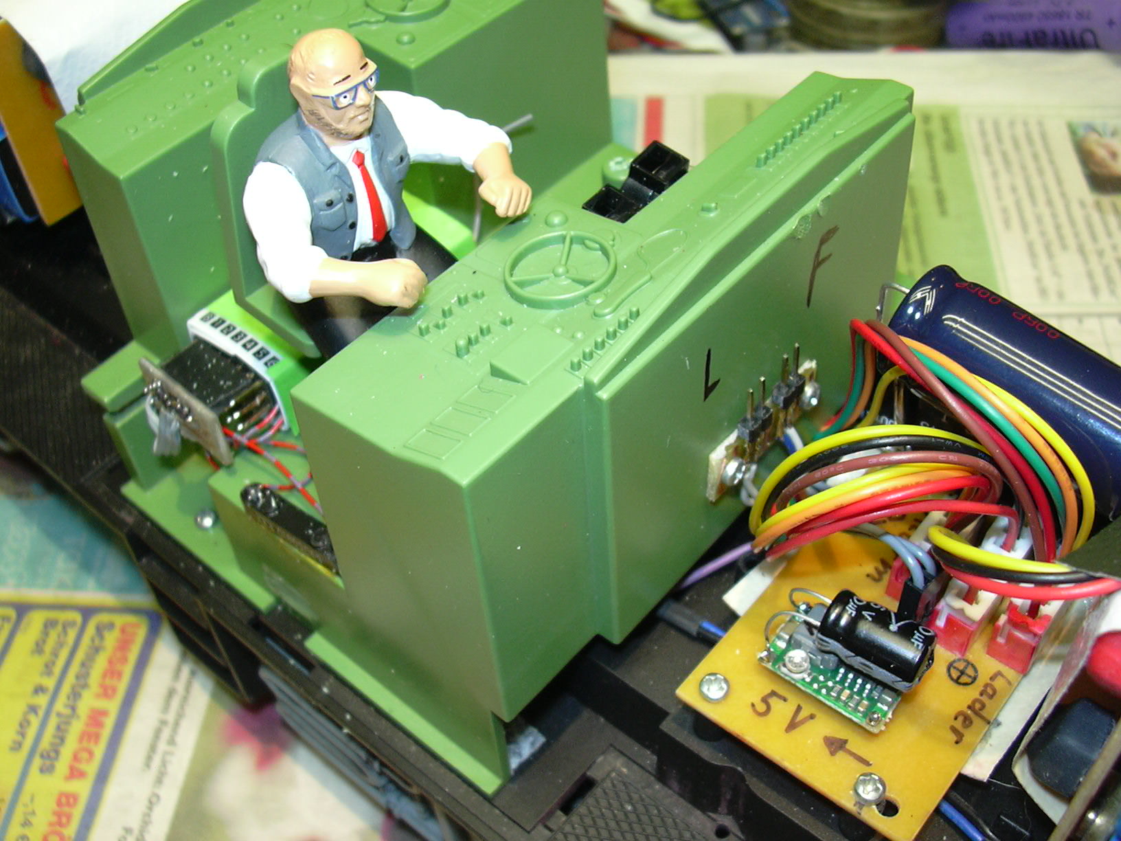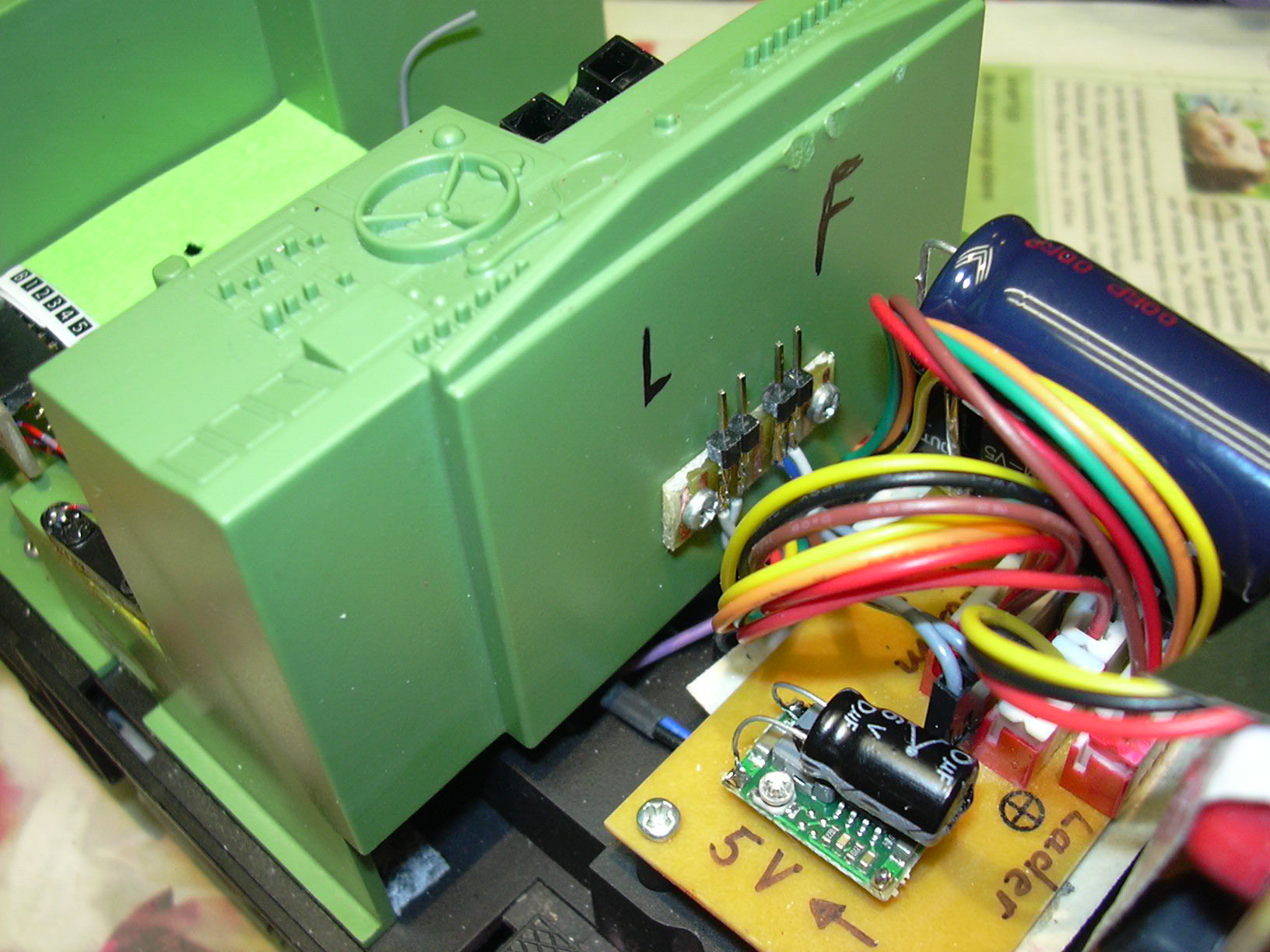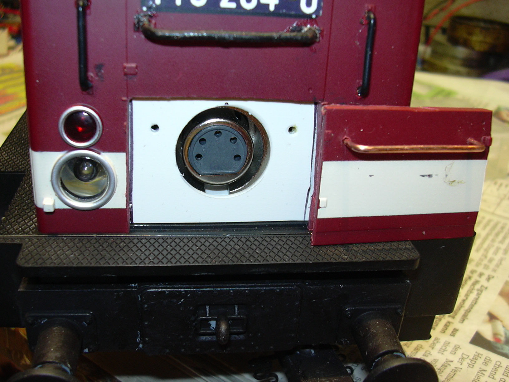 Damit beim Abnehmen und Aufsetzen des Lok-Gehäuses die Innenverkleidung angeschraubt bleiben kann, wurden die Anschlüsse für Scheinwerfer und Innenbeleuchtung (steckbar) verlängert und die neuen Stiftleisten an die Wände der Innenverkleidung montiert.