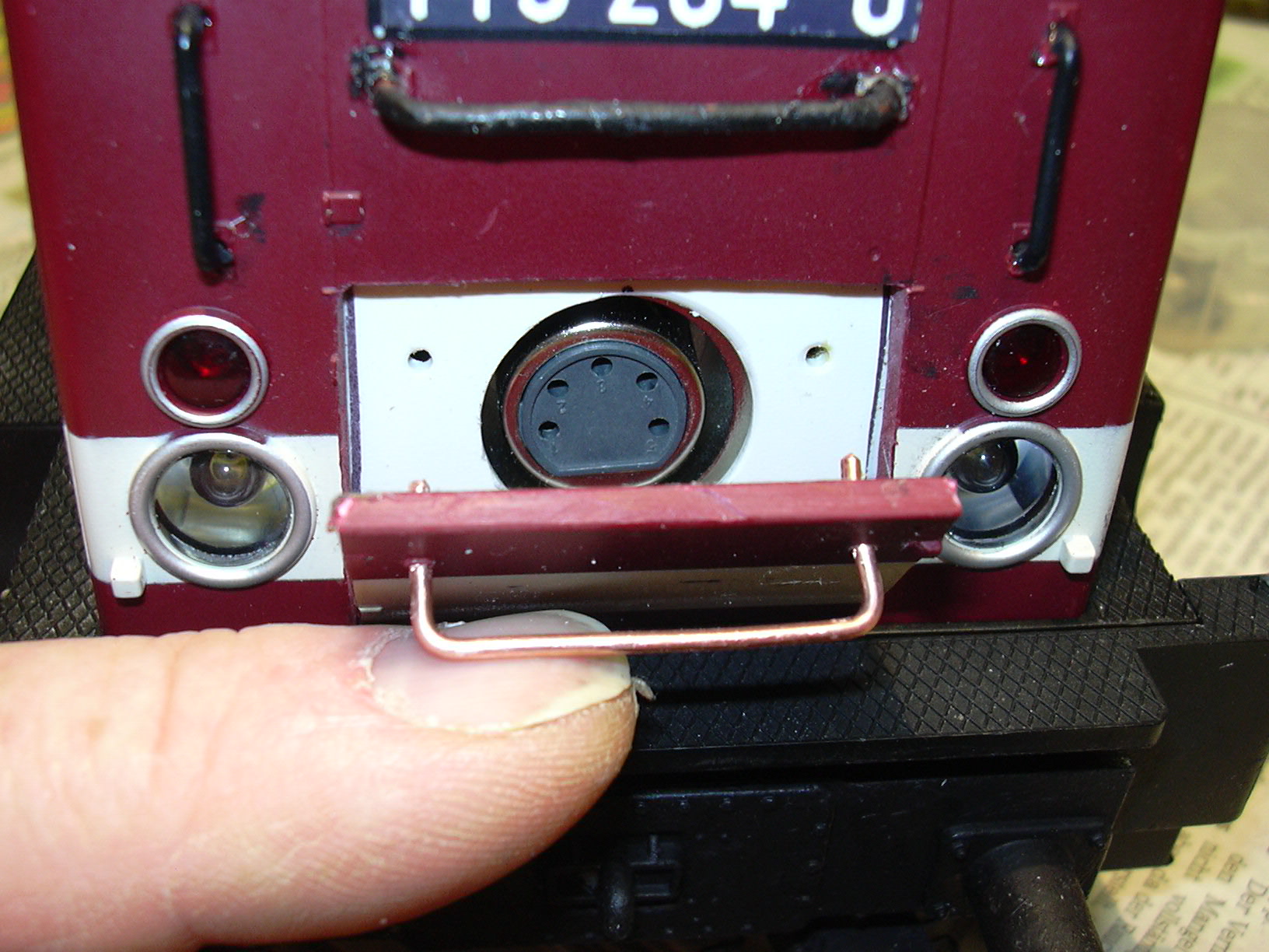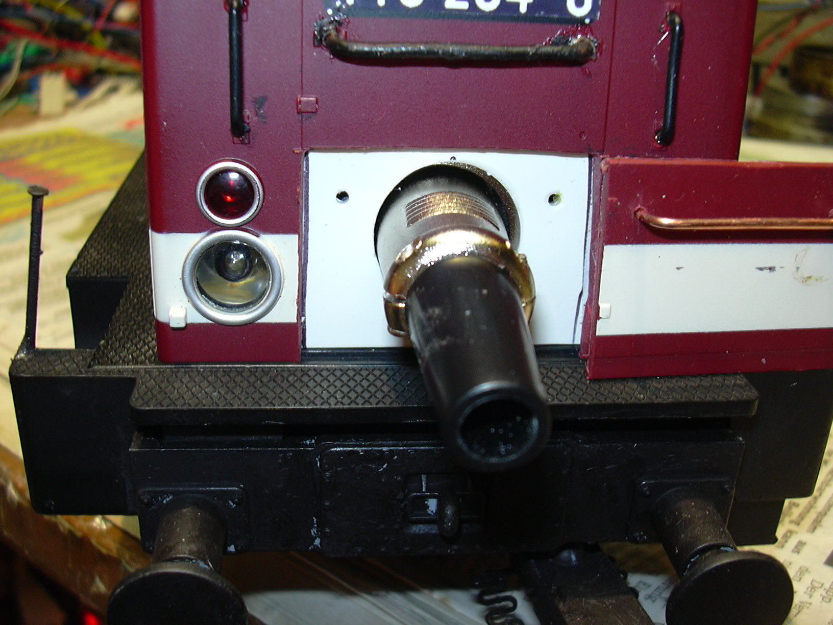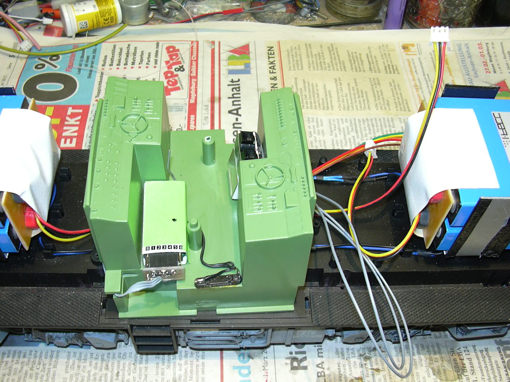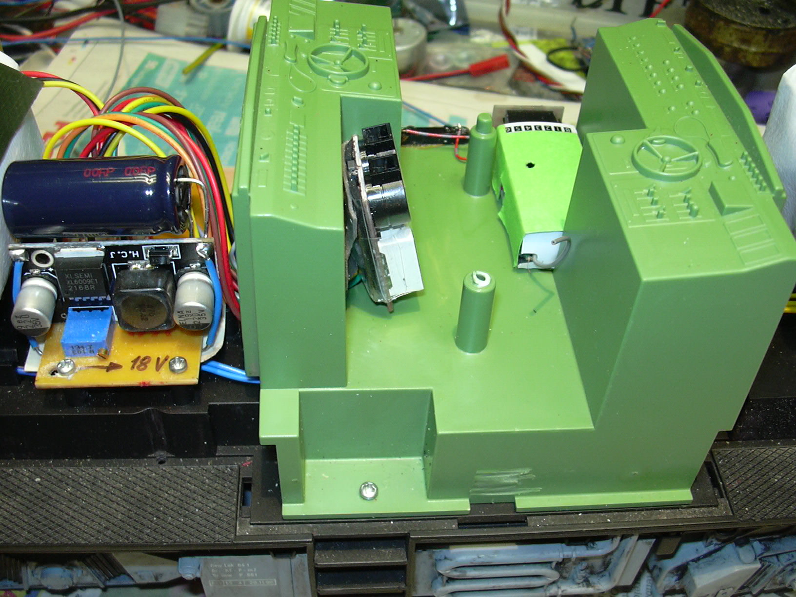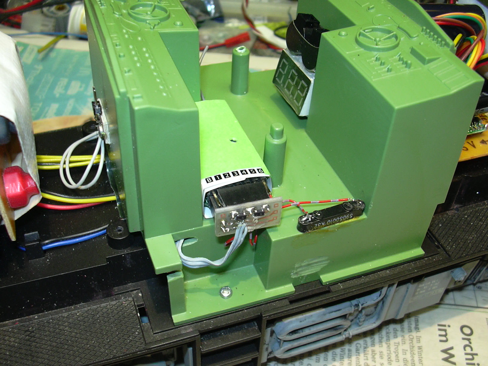Damit beim Abnehmen und Aufsetzen des Lok-Gehäuses die Innenverkleidung angeschraubt bleiben kann, wurden die Anschlüsse für Scheinwerfer und Innenbeleuchtung (steckbar) verlängert und die neuen Stiftleisten an die Wände der Innenverkleidung montiert.
