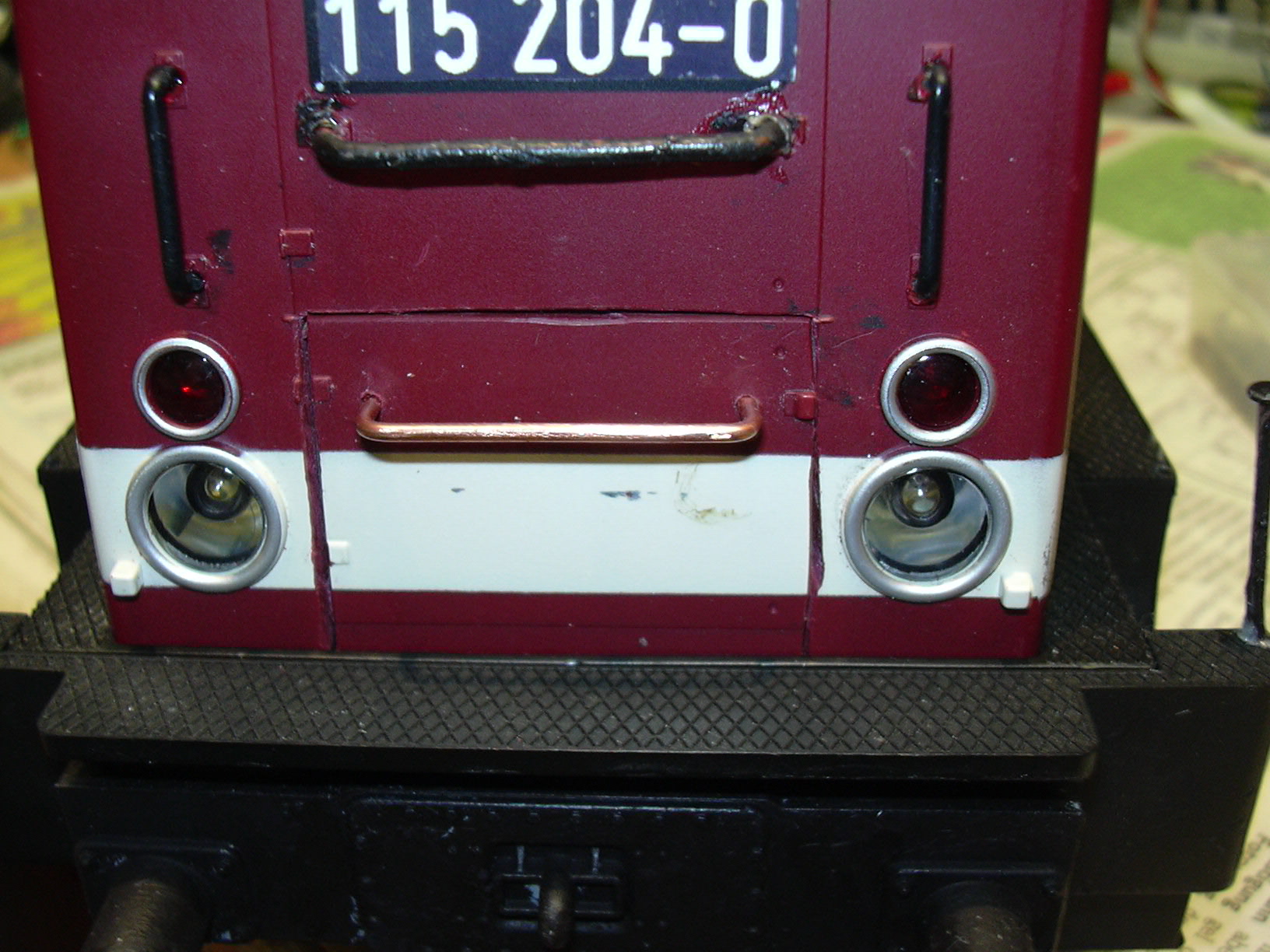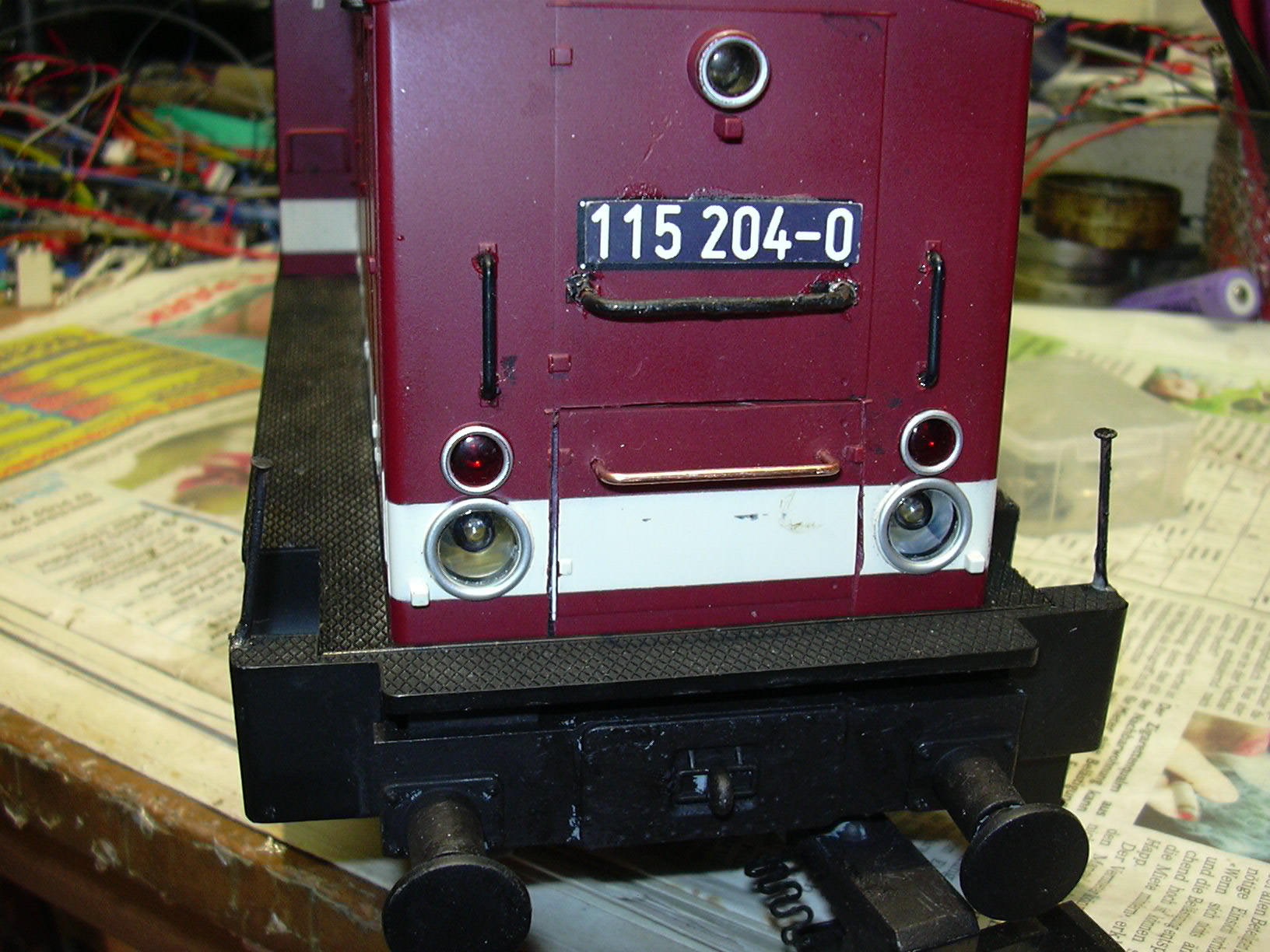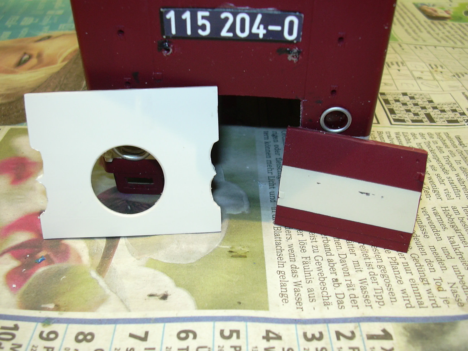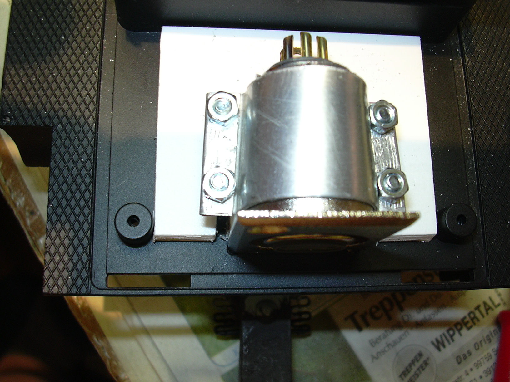 Damit beim Abnehmen und Aufsetzen des Lok-Gehäuses die Innenverkleidung angeschraubt bleiben kann, wurden die Anschlüsse für Scheinwerfer und Innenbeleuchtung (steckbar) verlängert und die neuen Stiftleisten an die Wände der Innenverkleidung montiert.