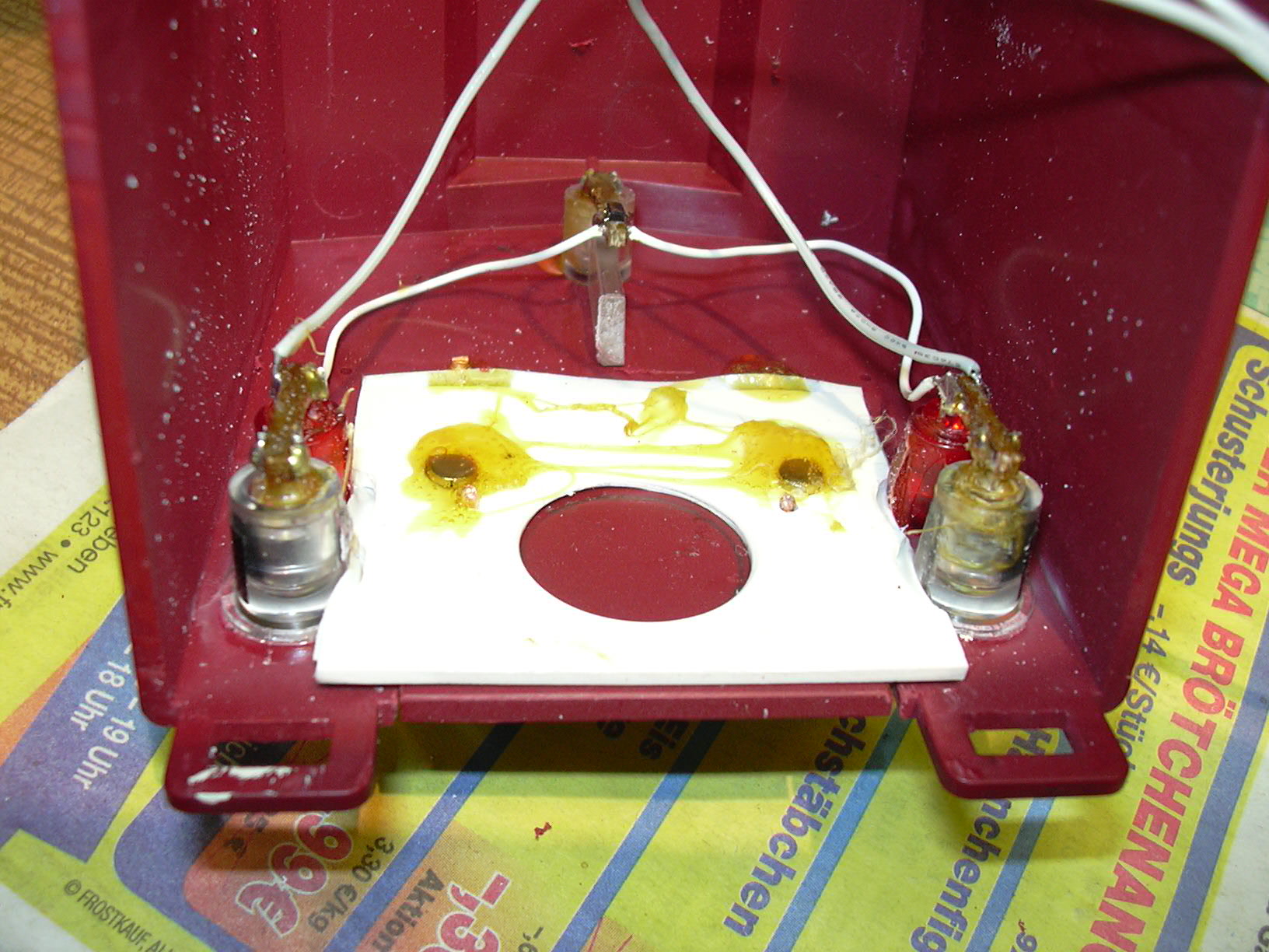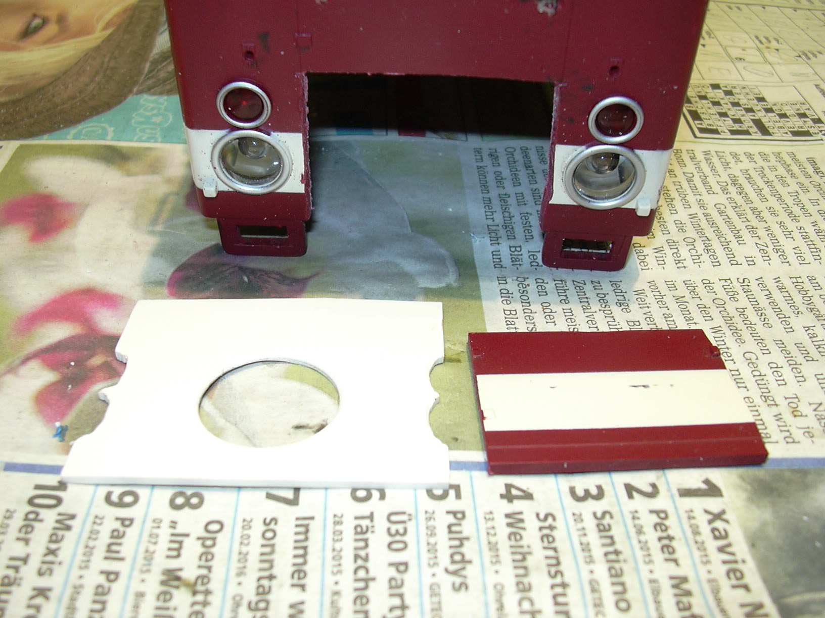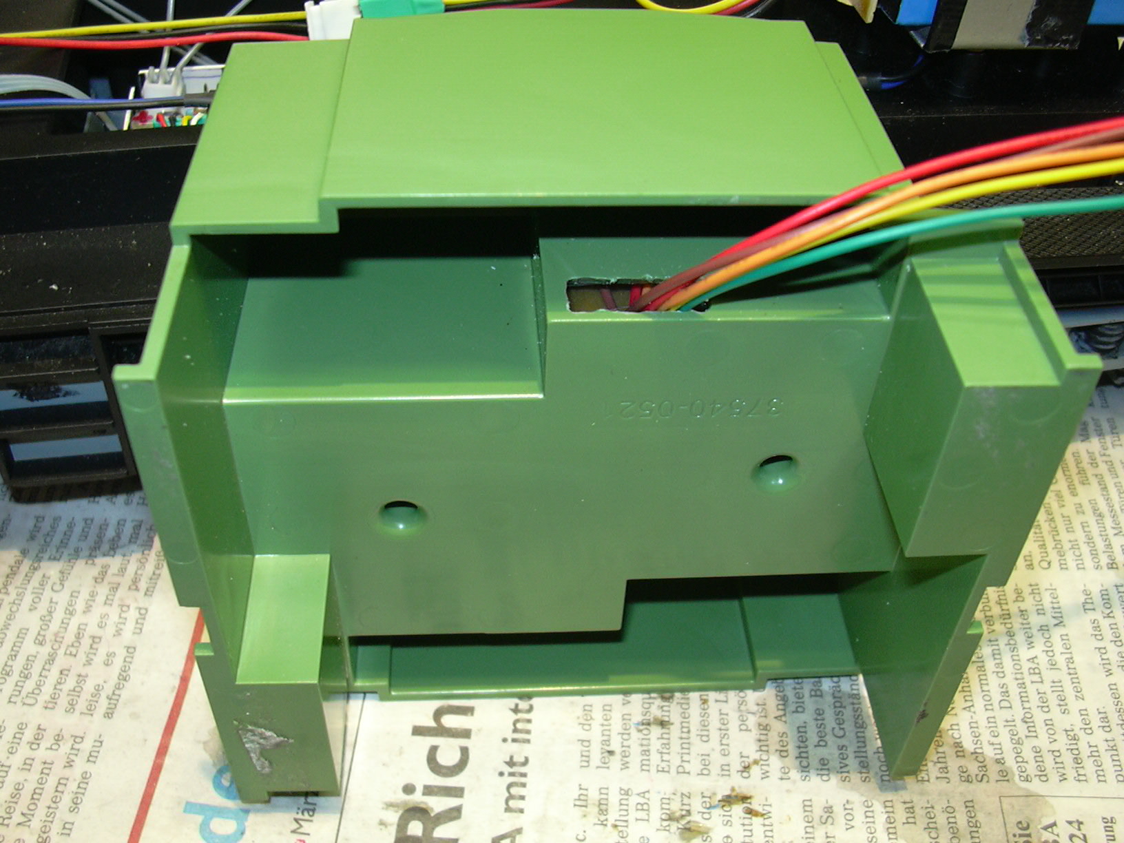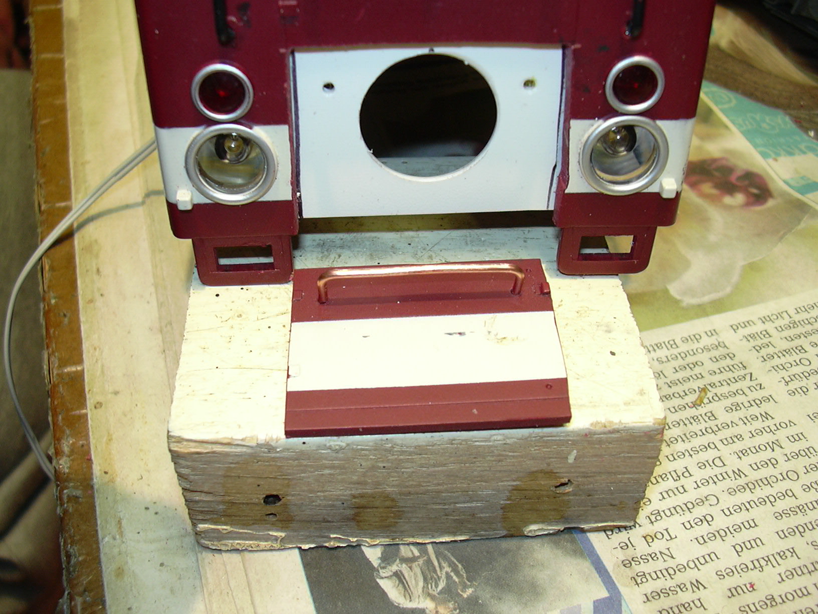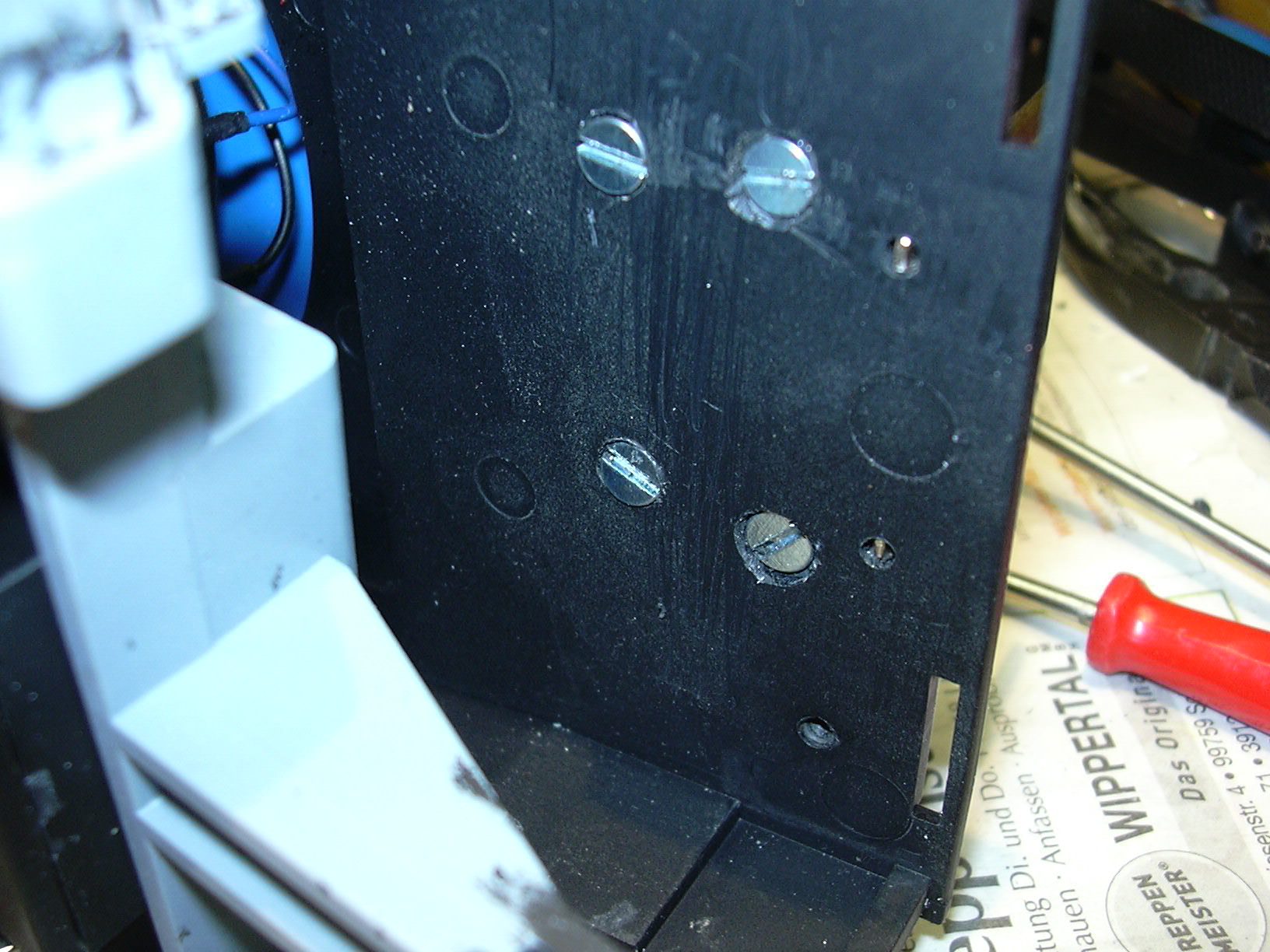 Damit beim Abnehmen und Aufsetzen des Lok-Gehäuses die Innenverkleidung angeschraubt bleiben kann, wurden die Anschlüsse für Scheinwerfer und Innenbeleuchtung (steckbar) verlängert und die neuen Stiftleisten an die Wände der Innenverkleidung montiert.