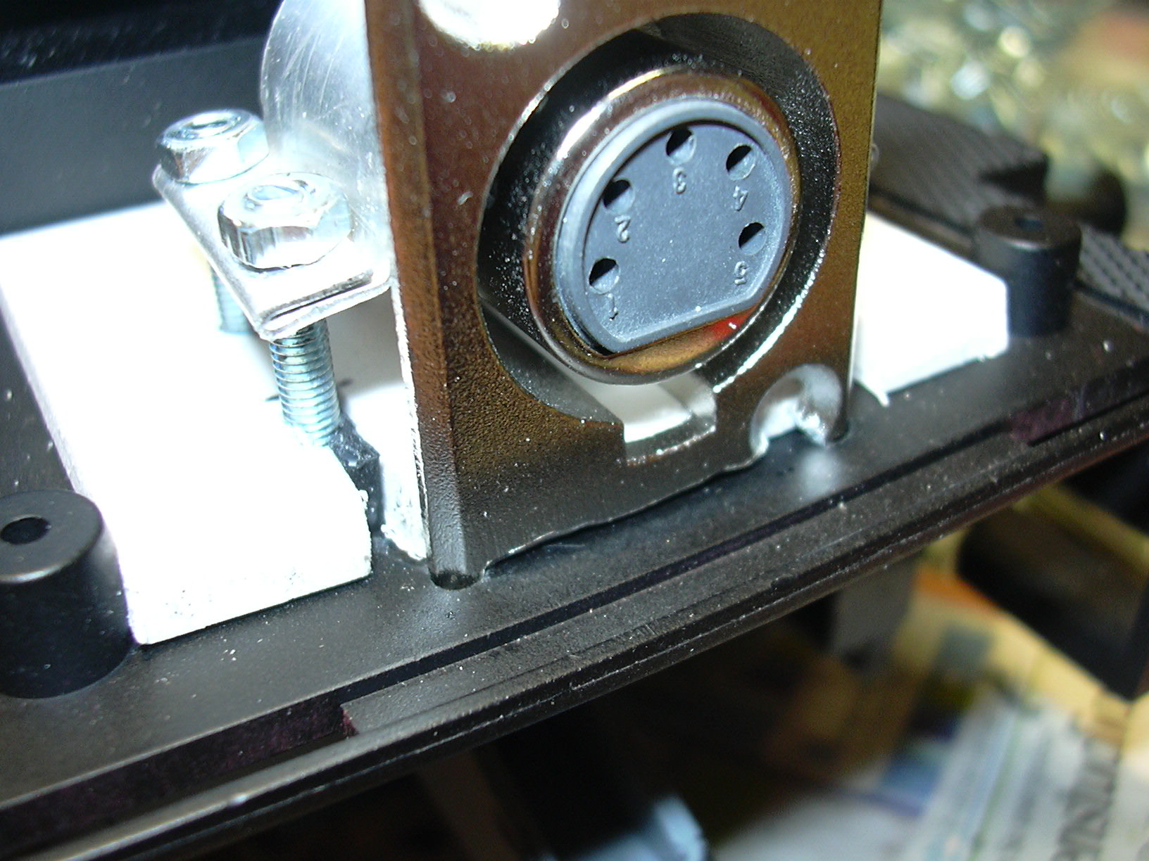 ...wurde mit einer Schelle und einer Zwischenplatte auf den Rahmen montiert. Am unteren Rand des Flansches wurde etwas Maertial abgeflext, so dass zwei Stifte stehen blieben, die in Bohrungen des Rahmens reichen und die Buchse gegen Verschieben sichern.