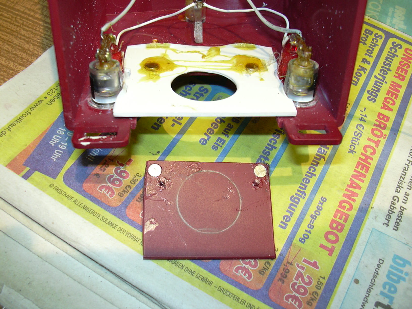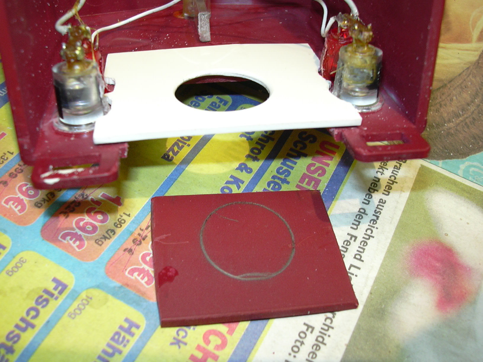 ...und eine Platte aus ABS zugeschnitten und das 20mm-Loch für den Ladestecker gebohrt.