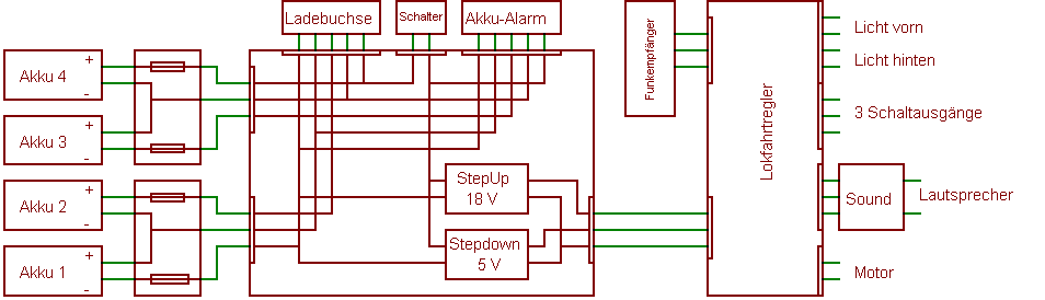 Ein StepUp-Schaltregler erzeugt aus der Akku-Spannung etwa 18 V für Fahrmotoren und Licht. Ein Stepdown-Schaltregler erzeugt aus der Akkuspannung 5 V für die Mikrocontroller des Lokfahrtreglers und Soundmoduls, sowie für den Funkempfänger.
