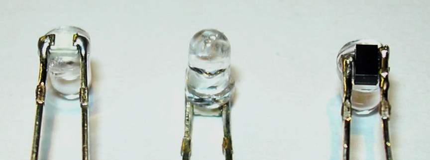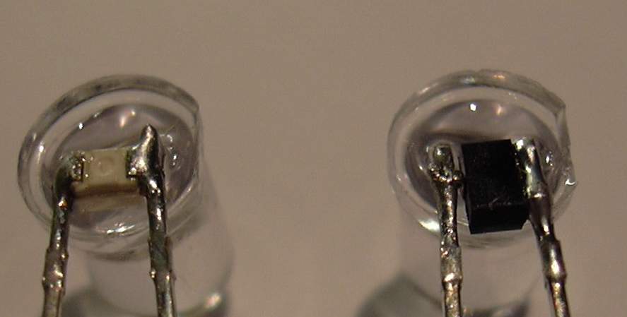 ![]() Dieses Foto zeigt umgebaute 5mm-LEDs. Links ist eine rote SMD-LED aufgelötet, rechts eine Doppeldiode in SOT23. |