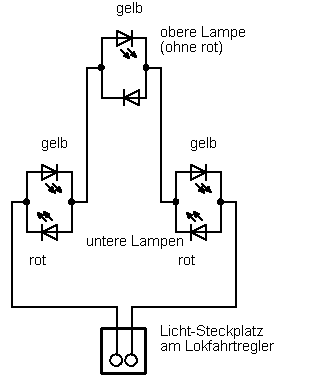 Für die Scheinwerfer der Triebfahrzeuge werden zweifarbige LEDs eingesetzt. Da diese schlecht zu bekommen sind, ist hier Eigenbau angesagt. Dazu werden eine helle gelbe LED und eine etwas dunklere rote LED antiparallel zusammengeschaltet. In der einen Polarität leuchtet die gelbe LED, in der anderen die rote. Da der mittlere obere Scheinwerfer kein rotes Licht bekommen soll, wird dieser gelben LED eine normale Schaltdiode antiparallel geschaltet. Dies leitet bei "Rotpolung" den Strom an der LED vorbei und verhindert dadurch Beschädigung der gelben LED durch überspannung in Sperrichtung, ist aber auch dafür zuständig, dass die roten LEDs der anderen Scheinwerfer überhaupt leuchten können. Die drei Doppel-LEDs werden einfach in Reihe geschaltet und am Lichtanschluss des Lok-Fahrtreglers angeschlossen. Die Strombegrenzungswiderstände befinden sich bereits auf der Lok-Fahrtreglerplatine. Diese Schaltung ist für vorn und hinten separat aufzubauen. Der Lok-Fahrtregler hat dafür auch separate Anschlüsse. |