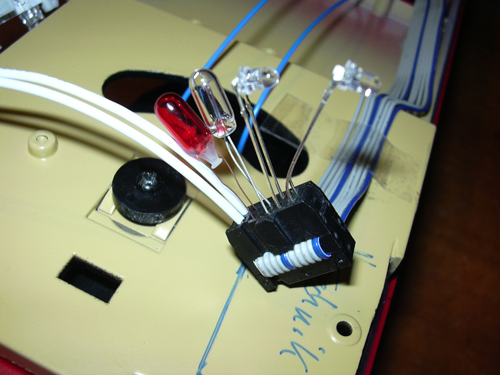 Das Chassis stammt von einer LGB-Taurus, die eigentlich ein Fehlkauf war, da sie vom Stil her nicht zum Rest des stilechten Bimmelbahn-Fahrzeugpark passt. Die Eigenbau-Karosserie enthält zwei "Technik-Räume", die auch für Technik genutzt werden. Auf der linken Seite ist ein 10-poliger Steckverbinder zum Anschluss der Scheinwerfer und Schaltfunktionen (Licht, Steckdosen), die sich allesamt in der Karosse befinden. Dort sind zur Demonstration 2 Zweifarb-LEDs, 2 Glühlämpchen und 1 LED-Leiste angeschlossen.