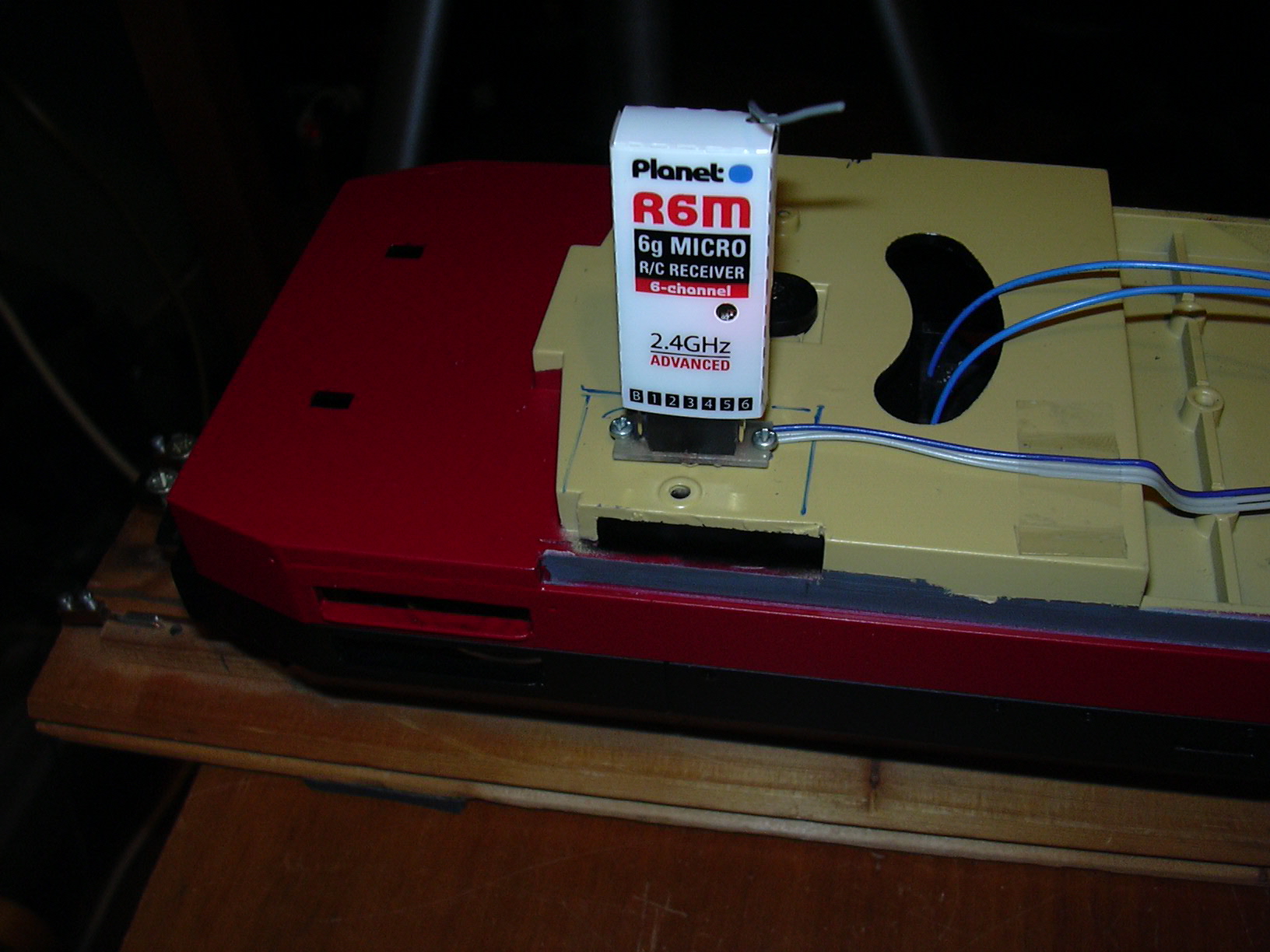 An der rechten Seite ist der Stecker des Empfängers angeschraubt. Dies vermindert Empfangsstörungen, denn die Bodenplatte soll noch mit Metallgewichten ausgelegt werden, was den Funkempfang stören würde, wenn der Empfänger am Fahrtregler (also unter den Gewichten) wäre.