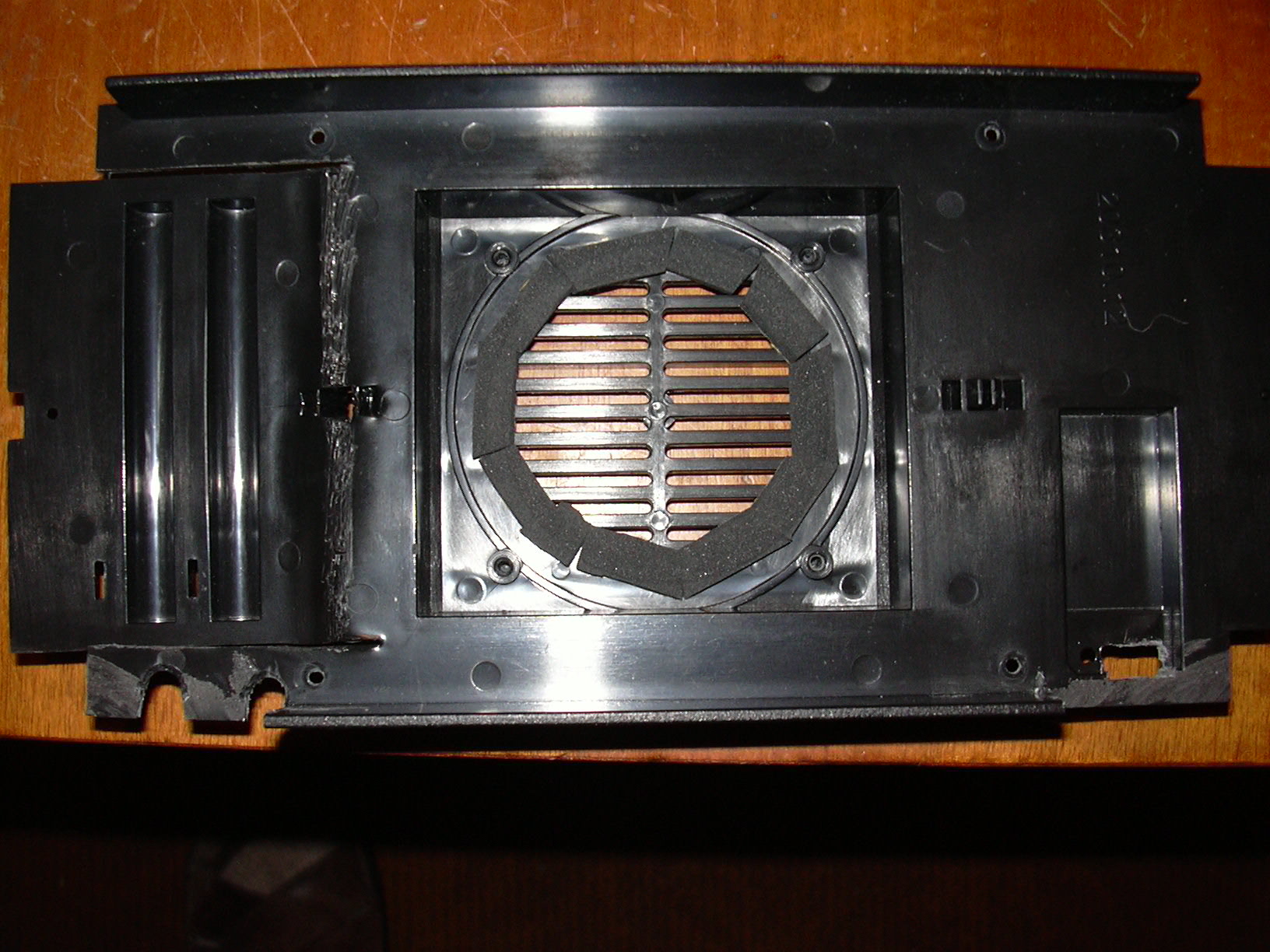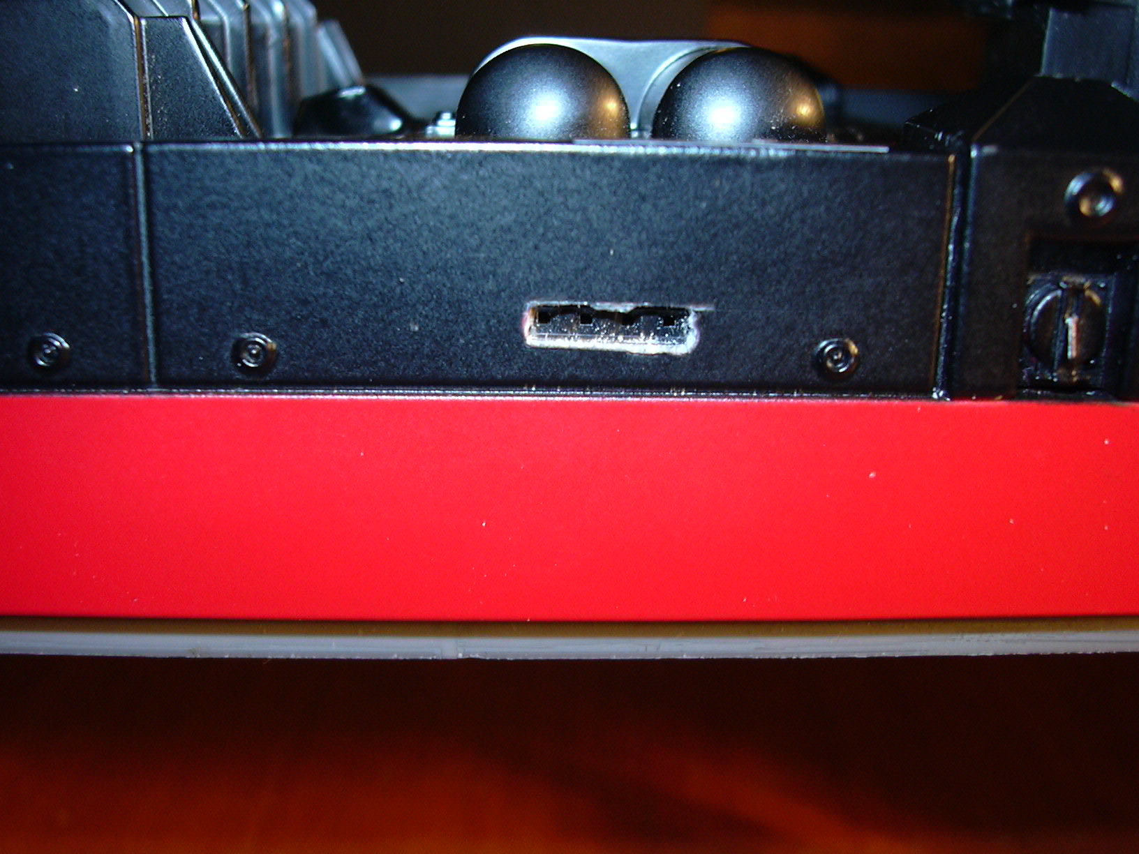 Die Bodenwanne. Die Lautsprecheröffnung in der Mitte ist mit etwas Moosgummi ausgeklebt, das den Lautsprecher gegen das Klebeband seiner Befestigung drückt. Rechts unten ist der Durchbruch für den Batterieschalter. Links musste die Flex ran, da die Akkus zu dick sind. Da wurde eben die Bodenplatte aufgeschlitzt und mittels Heißluftpistole etwas verbogen. Die Akkus passen nun rein, die Schlitze kann sich Manfred selbst wieder zukitten. Die halbrunden Aussparungen links unten schaffen Platz für die Schraubenköpfe der Ladebuchse.